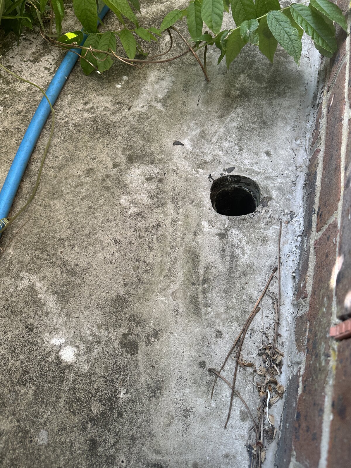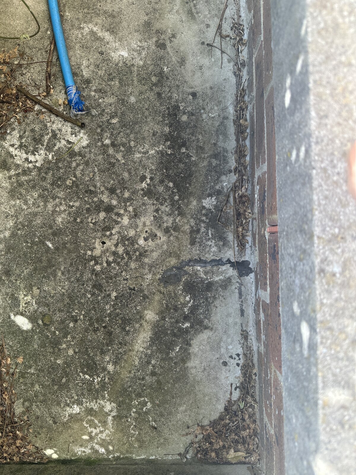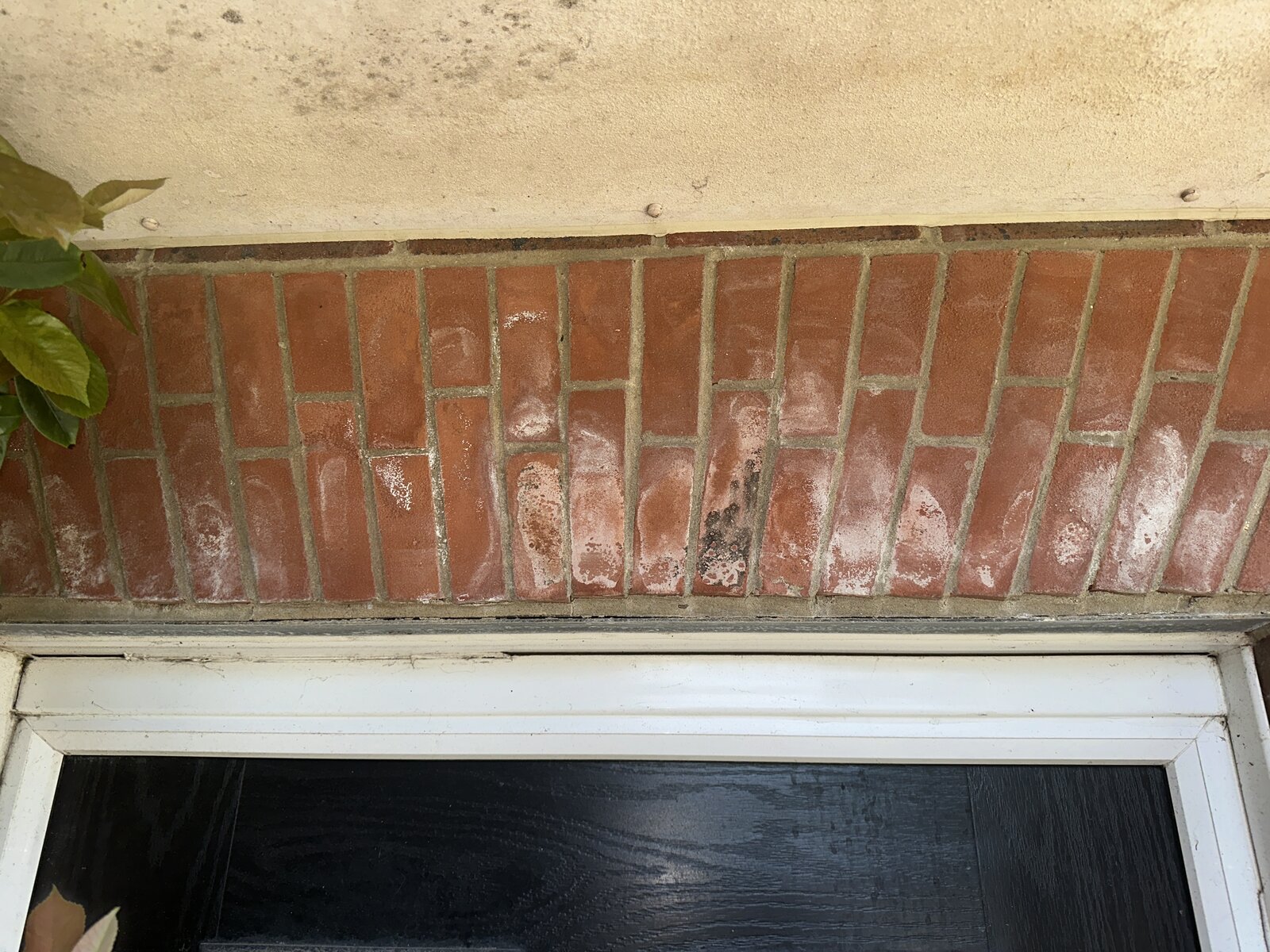This hole has appeared after a particularly wet winter, and occasionally drips - particularly if the wind is blowing rain towards the house. We live in a bit of a wind tunnel, so this occurs quite regularly. Above the door an en-suite bathroom, with a decorative balcony outside the window. I tried sealing the gap between the balcony and the brickwork, but didn't do a fantastic job, although I'm not even certain this is the issue.