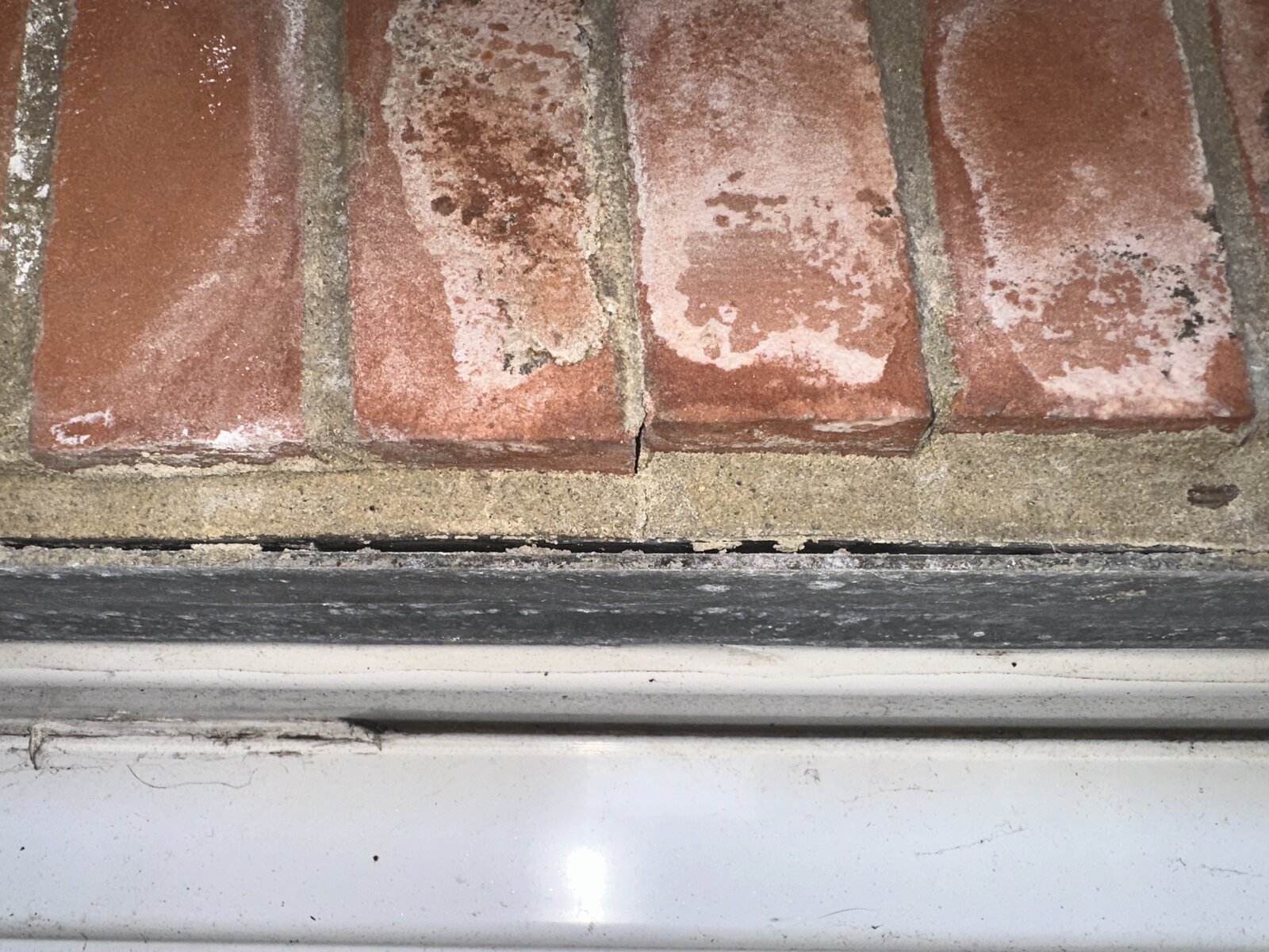 As you can see - the bricks look quite saturated, and there is a gap in between the lintel and concrete. Our house is 11 years old, and I'm at a bit of a loss as to how to fix the primary issue, and then repair it. It may be a professional job but I don't know who is best to contact to diagnose.