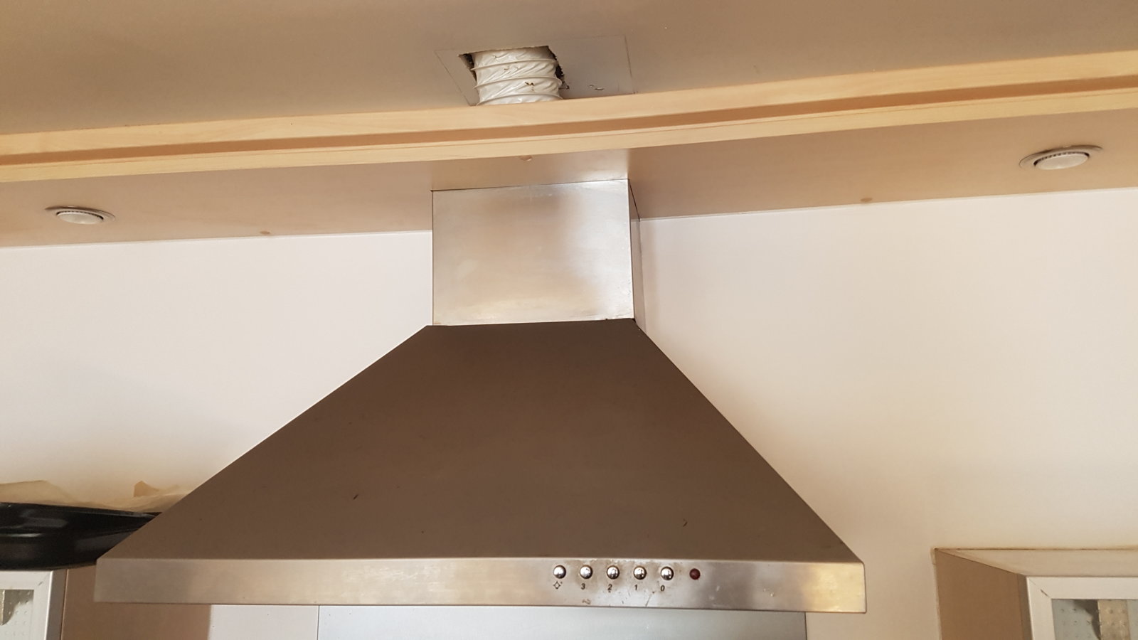 I'm looking to replace my cooker hood. As you can see from the pic, the chimney part goes through part of the kitchen unit. The hole is approx 235mm wide and 180mm deep. (Ducting exposed as I unscrewed it to investigate what's underneath)