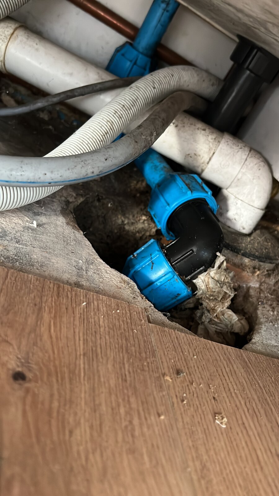 Ok thanks - expanding foam okay? And by joint i assume you mean up to the blue nut that's in line with the floor? Do you also think this is the cause of the excess condensation on the surrounding pipes?