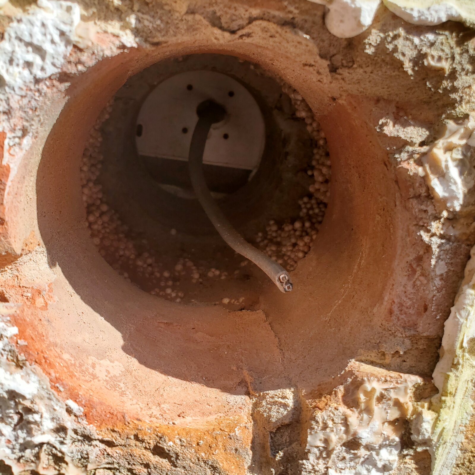 You need to remove and disconnect that cable first of all. Externally for a professional finish you need to get some matching bricks, remove the damaged ones and replace with full bricks. Internally you could just get a tin of expanding foam and fill the void with it then plaster skim over it.