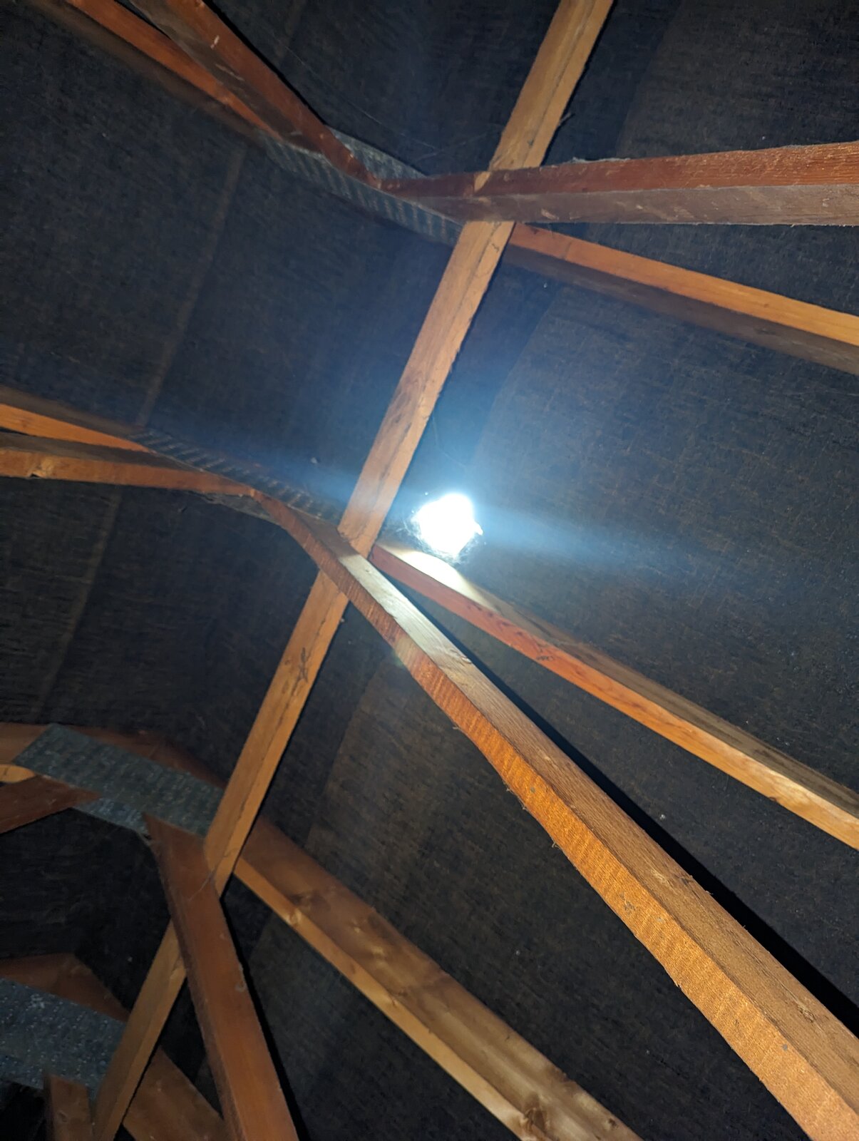The survey showed a concerning hole near the ridge where an old flue used to be. It appears that the seller, or perhaps previous owner before them, removed the flue but didn't bother to take care of the result 4-5 inch hole left over. There is visible staining of the loft floor boarding where water has entered through this hole and dropped on the the boards.