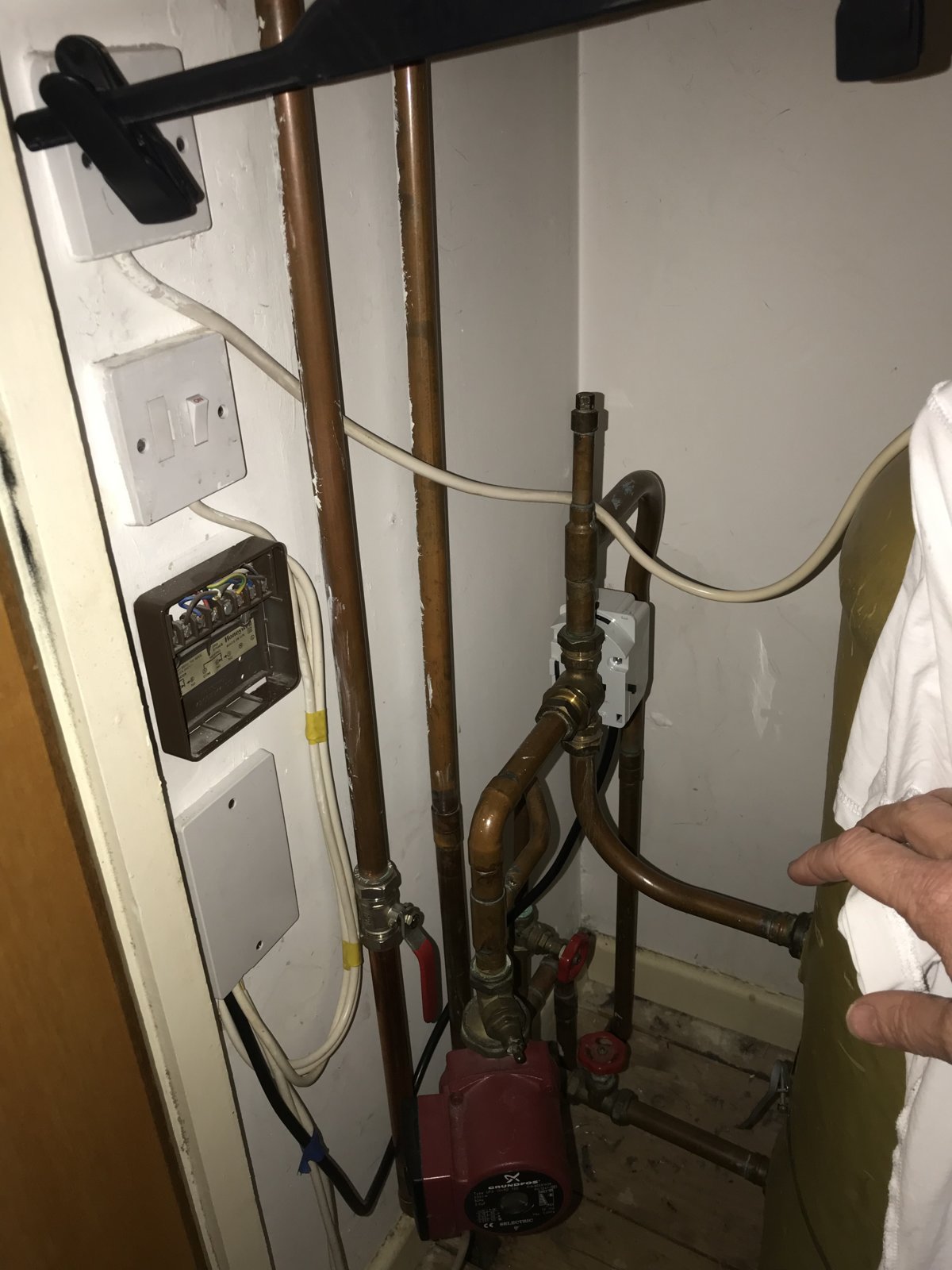 I believe it may be a an F&E? It has a boiler in adjoining garage, copper tank and water tank(s) in the loft. The thermostat is a Honeywell, control box by copper tank and remote thermostat on the wall downstairs. pictures attached.