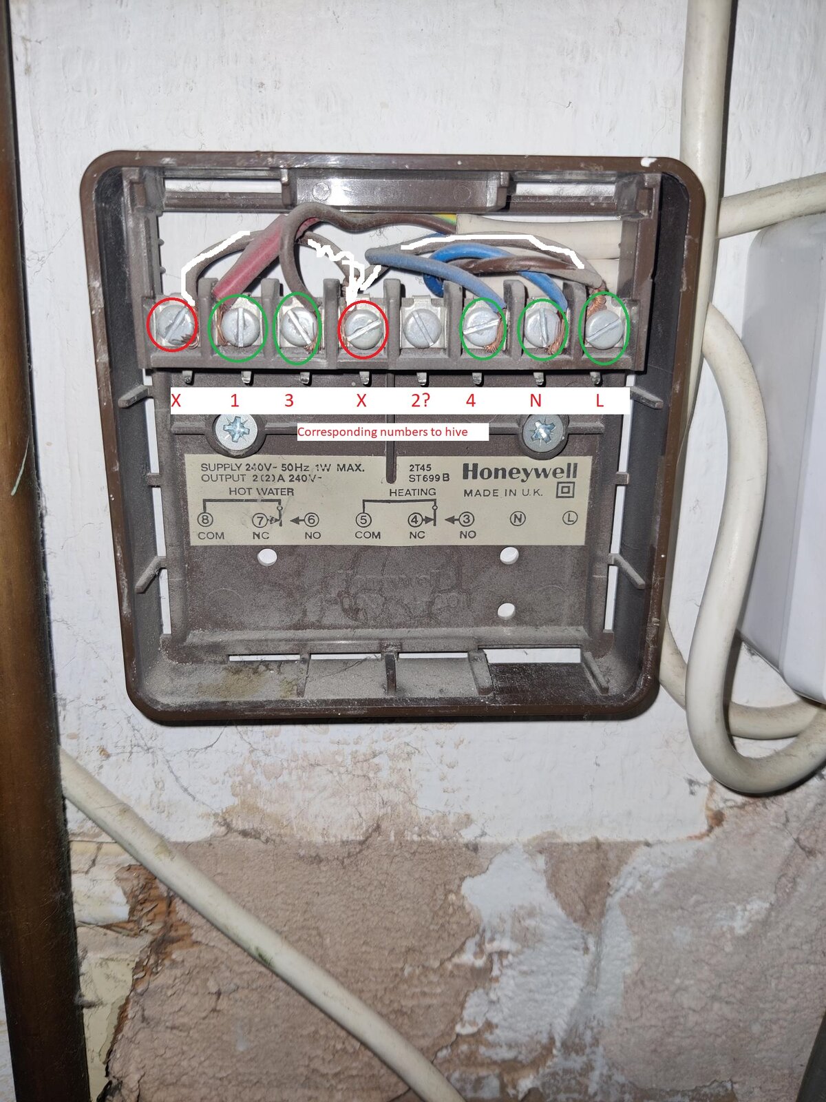 I've read the instructions and various threads/videos of other installations. I know there are 'live' links from 1 to 5 and 5 to 8 on the Honneywell. When you remove those it is then possible to translate current wiring to the Hive installation guide which I have done in the image.