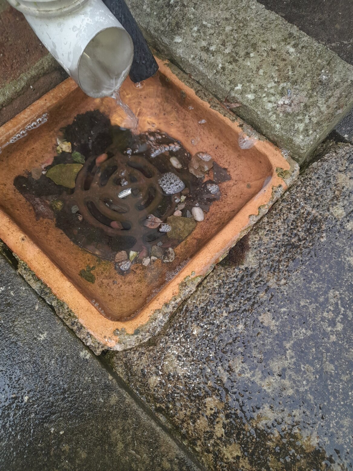 Start by scooping out the mud and stones from the gully (not "hopper"). This will expose the outlet. Is it broken or blocked?