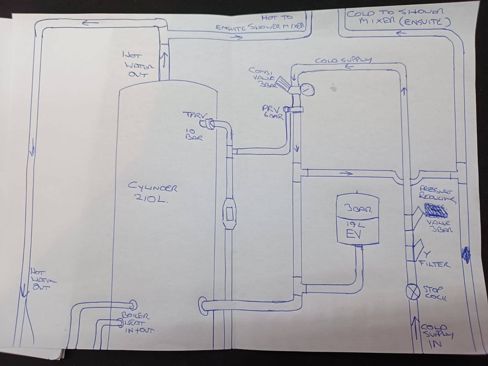 Our Ensuite shower is directly behind the wall where the cylinder is. That is why the shower hot and cold is exposed here. The hot feed to the shower is taken off the main hot supply out. The cold feed to the showers comes off a tee in the cold water mains supply after the Combo valve and PRV as shown. I presume this cold feed is also supplying the cold water to my other bathroom (shower, sink and bath), and cloakroom toilet (sink)??