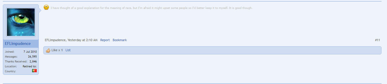 It's a far less related than my response to EFLImpudence's post, in the thread that I am no longer allowed to post.