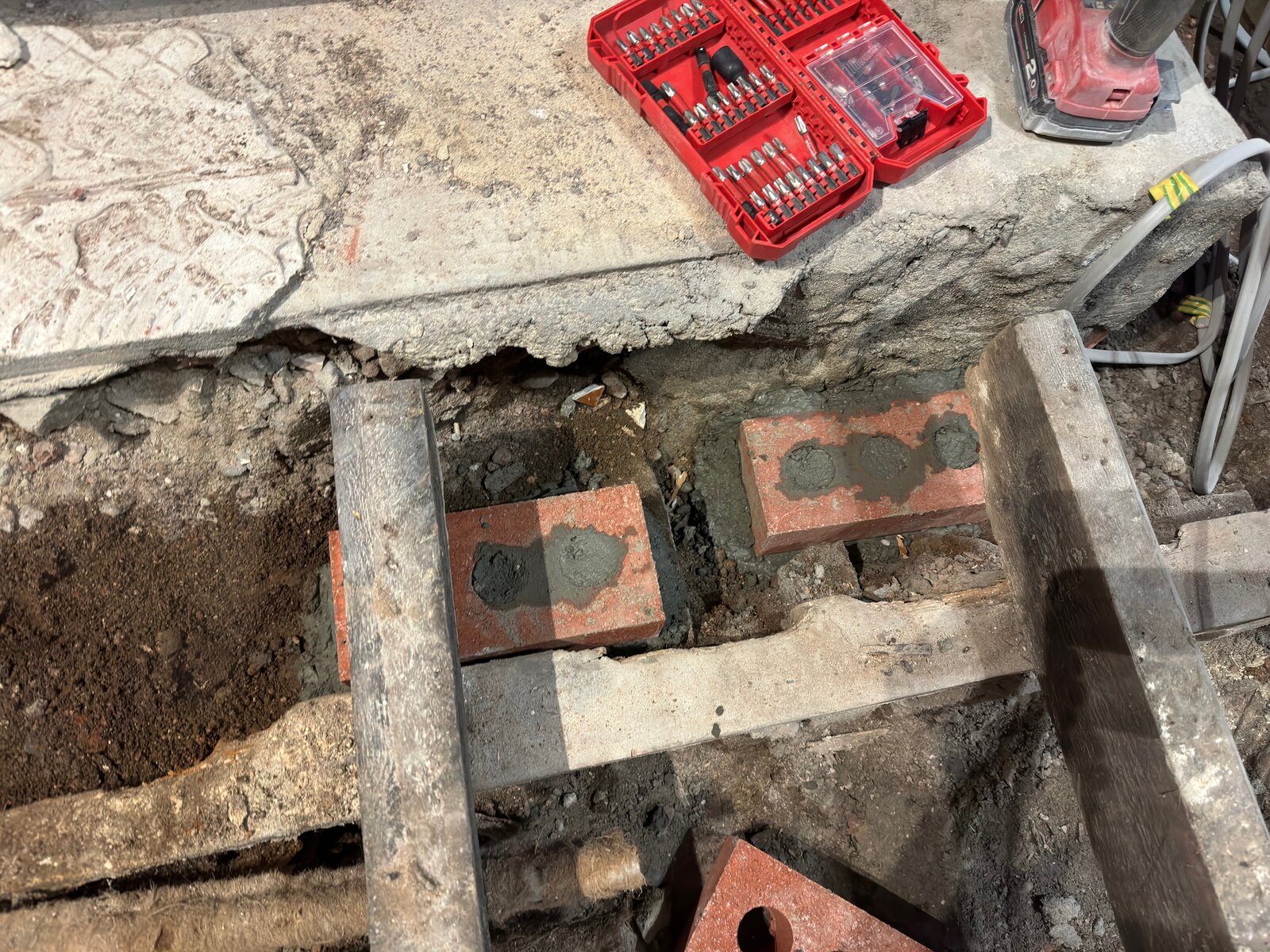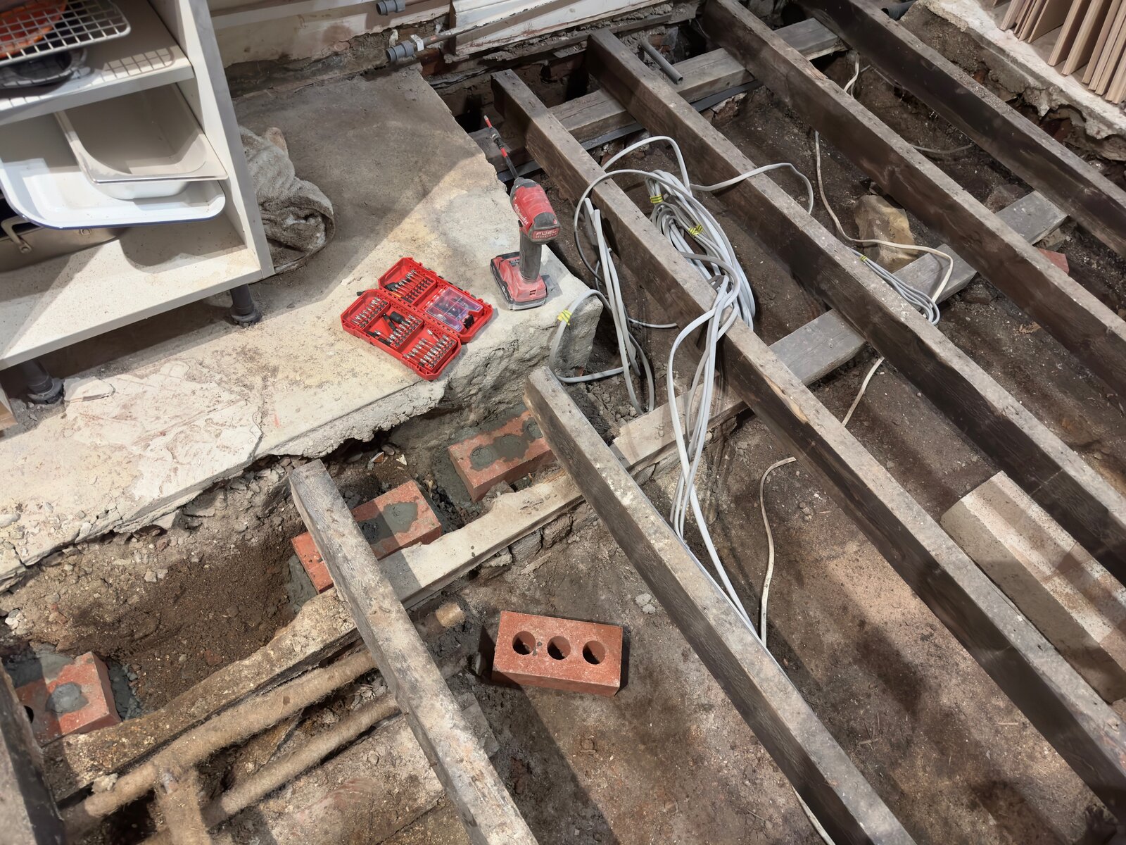 Given all this, my plan (already in action) is to concrete some bricks to the ground (see photos) and create a new foundation layer for the joists to rest on, using solids plastic shims (these) to get the right height. This obviously means the joists will not all be resting on the same beam (which i assume is helpful for stability). I guess I could add blocking/bridging between each joist to 'connect' them. They are all resting on the same beam at the other end of the room which is in good condition so im not touching that.