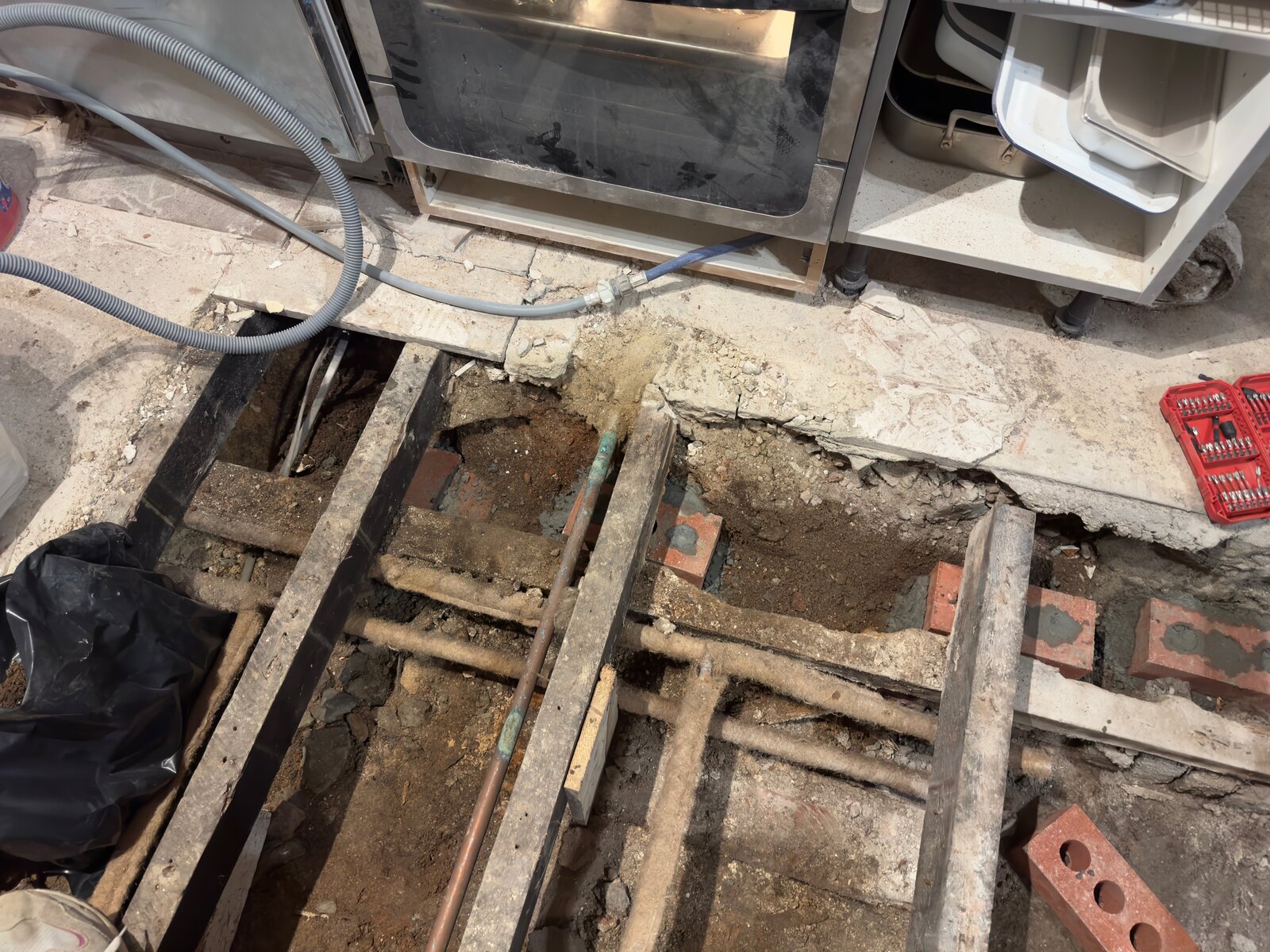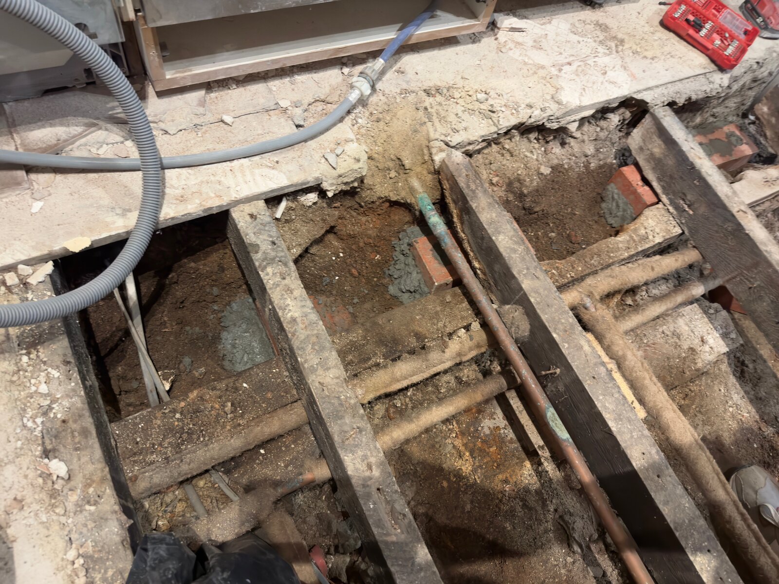 There is a copper gas pipe right next to it which makes things tricky. Also the brick layer under the beam seems very brittle and I'm sure when I remove the rotten beam the wall will fall apart.