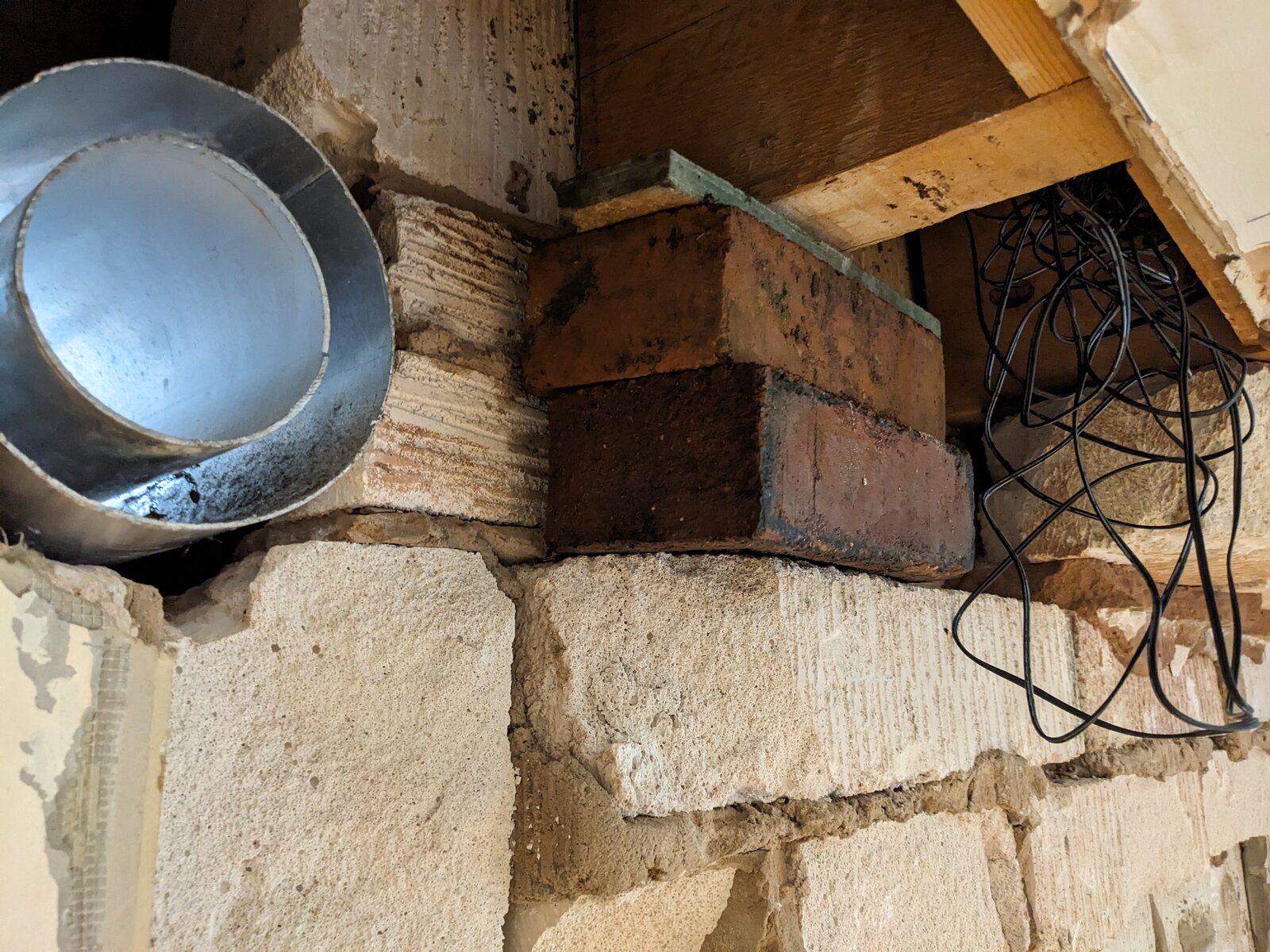 At one point of the old breeze block fireplace they've got a bit enthusiastic and removed block that was supporting a joist. Probably been like this for 10+ years. The other joists are still supported either into the wall or onto breeze blocks left from the original fireplace.