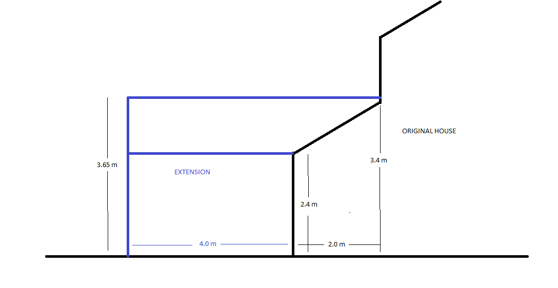 I'd like to build an extension 4m deep by 5m wide on the back of my detached house. The house was built with the ground floor 2m deeper than the 1st floor so there is a 2m deep protusion across the whole of the back with a pitched roof covering it. I thought that I could run a roof over the extension with the pitch at 90 degrees to the existing roof and joined onto it by to form 2 valleys at 45 degrees. The ridge of the new roof would be 25 cm higher than the exiting roof as I would sit the ridge board on the ridge board of the existing roof.