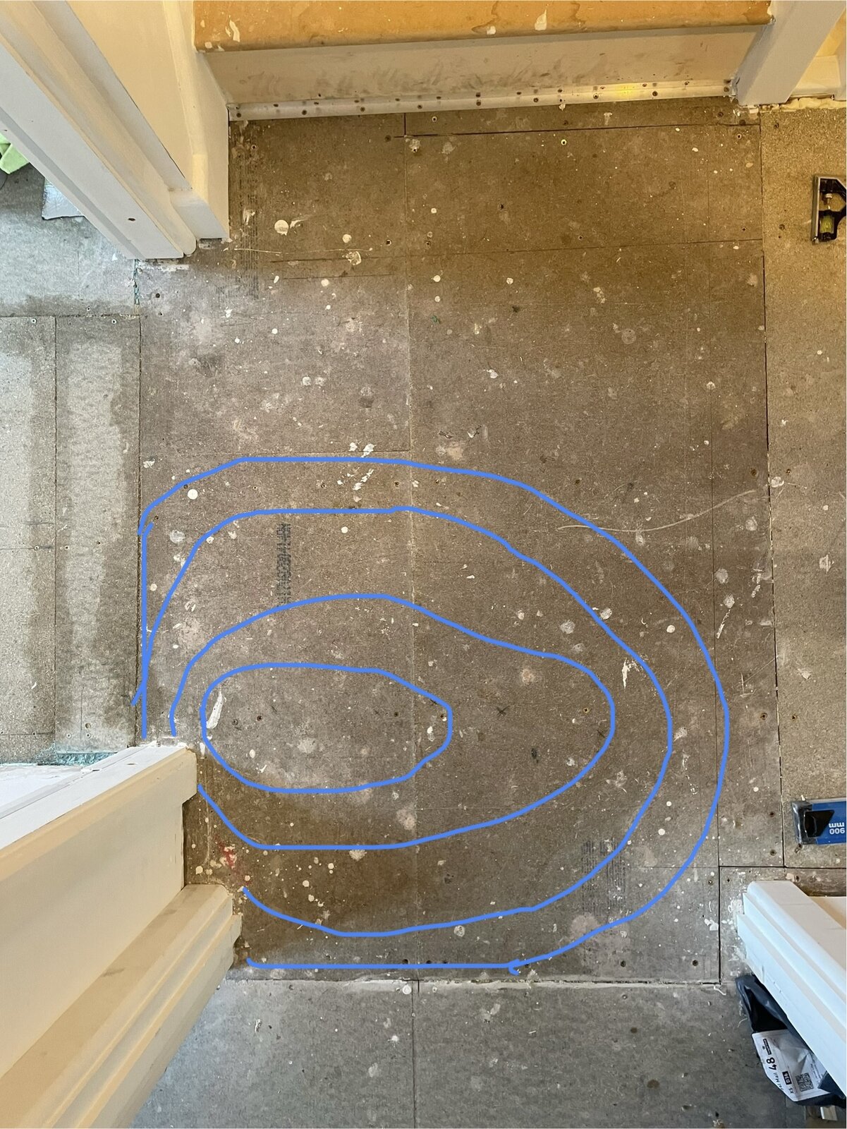The high spot is outlined by the blue contours. there is an I beam under the wall in the lower left that protrudes a few inches up across the doorway on the left