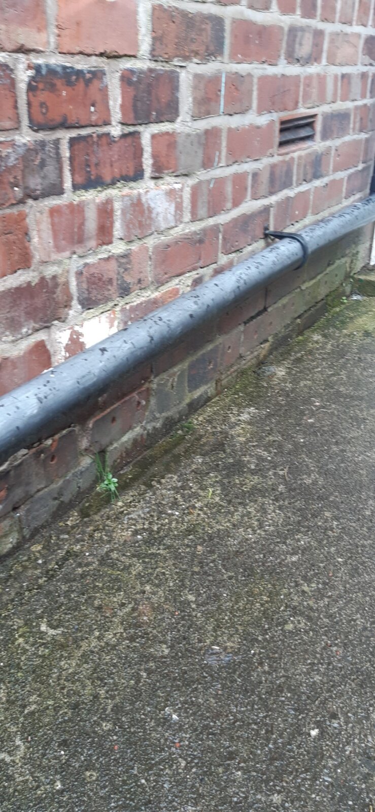 Please take some wider pics showing the entire wall, all the way up to the gutter and downpipes, and all the way down to the ground and paving. Show all pipes, drains, gullies and manholes.