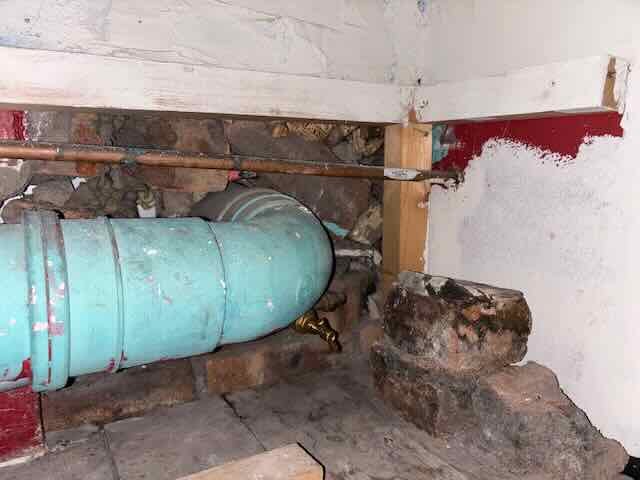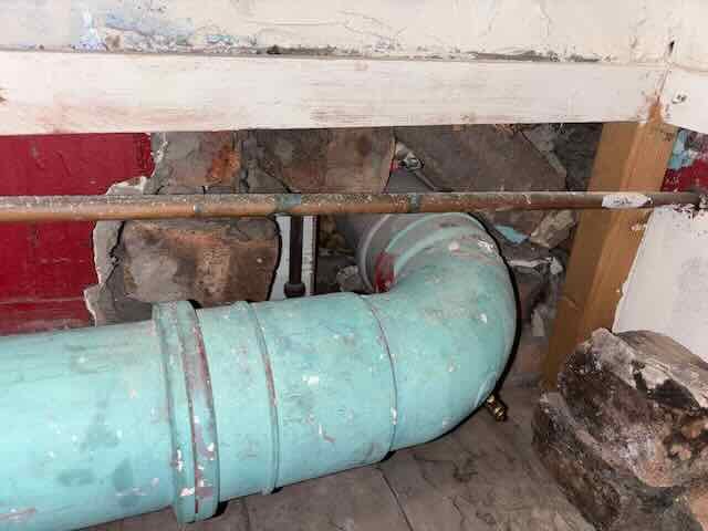 I found this big hole in the laundry room. It is an old tenement flat and the hole was probably made when they first installed the new drainage pipe.
