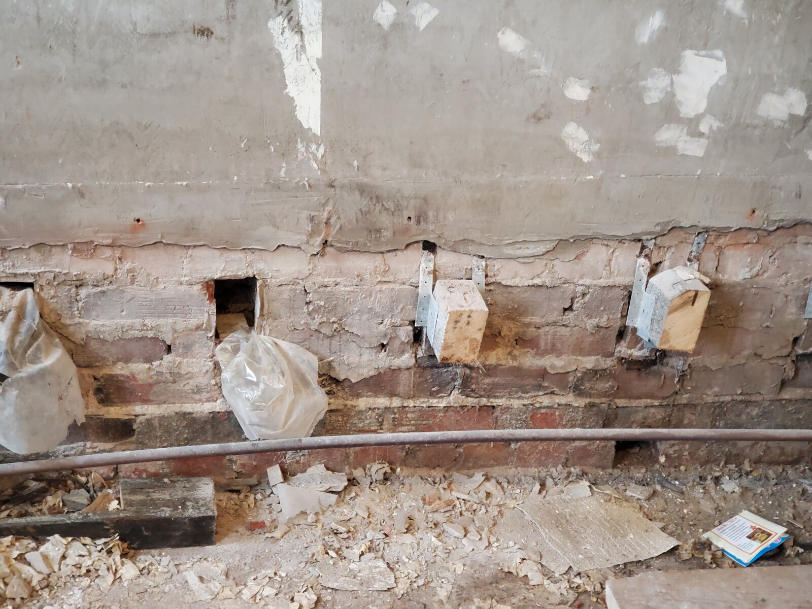 - Install new joists by laying them on three sub walls with air-bricks and putting slate under the joists