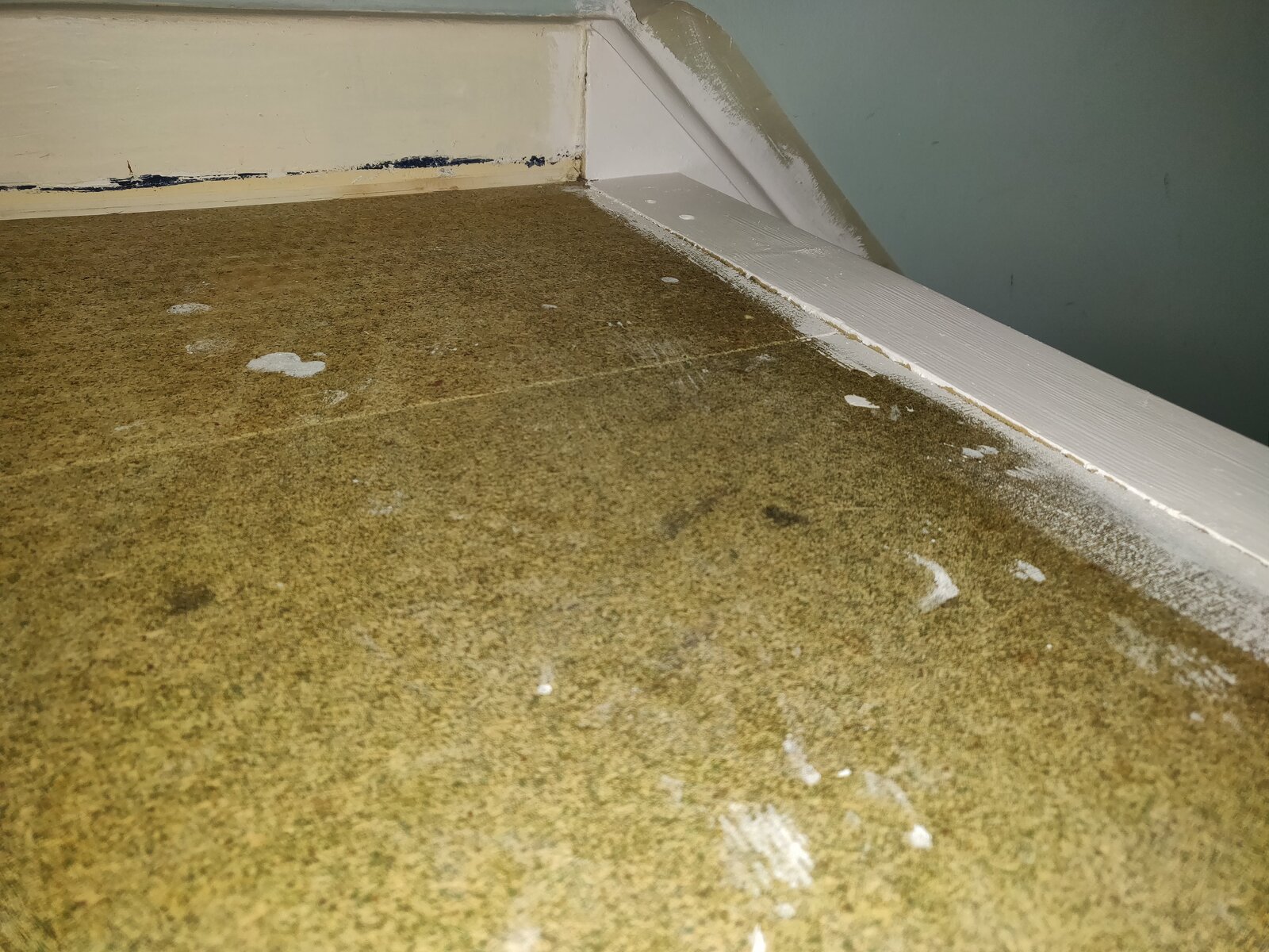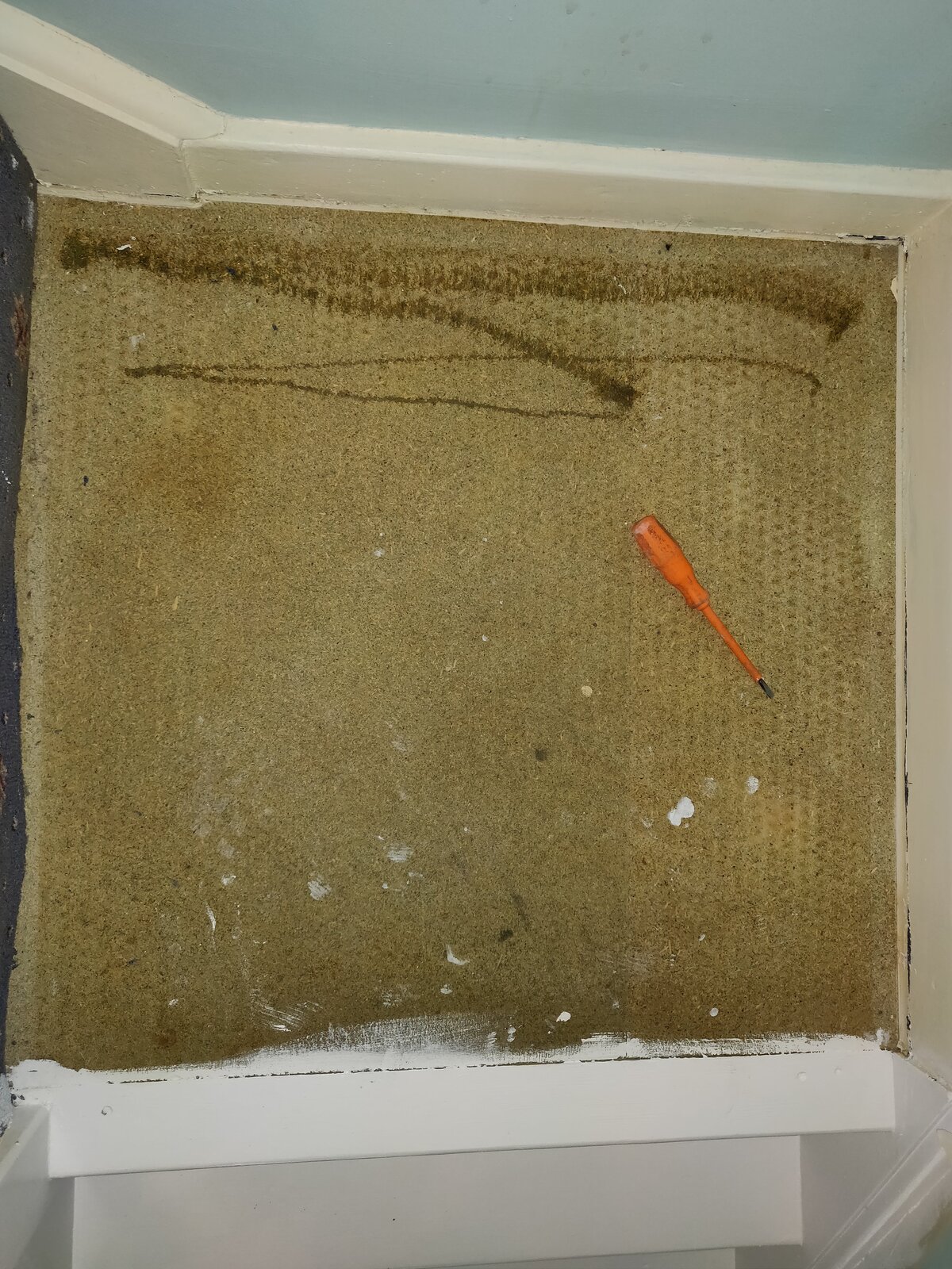 I had initially planned on laying a thin sheet of plywood over, painting it to match the stairs, then the runner of the stairs would cover much of the area of the landing anyway.