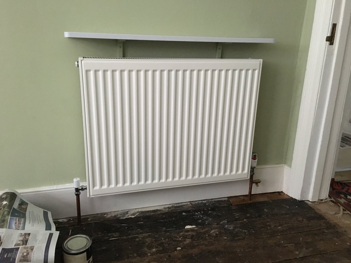 The U value of the outside wall and window is so high (poor) that the air flowing over a shelved rad is unlikely to be a problem.I disagree on the shelf based on the likely drafts (AC/h)]