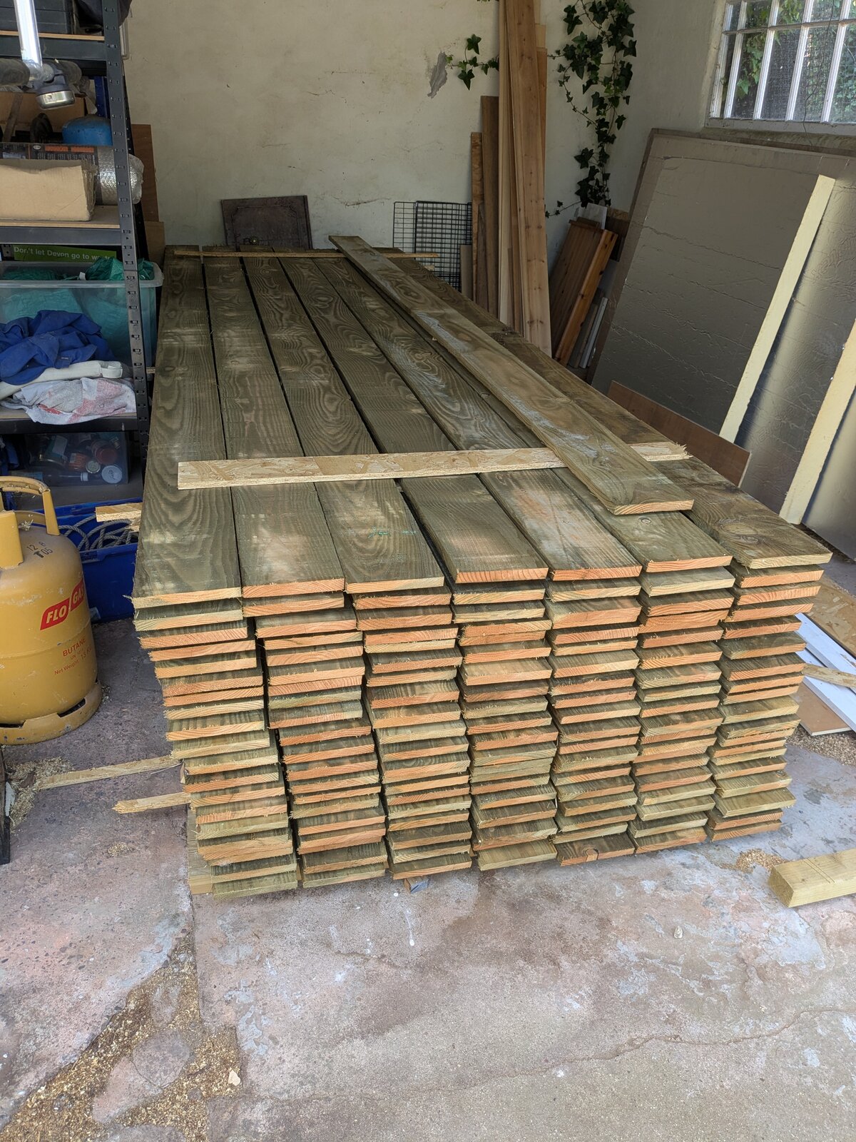 Here's a stack of treated boards I'm using to clad my workshop... I've cut a 15 degree angle onto one end (they are going to be vertical, "board on board").. retreated cut end with preservative, and am now drying out so as I can stain them some silly shade the missus chose....