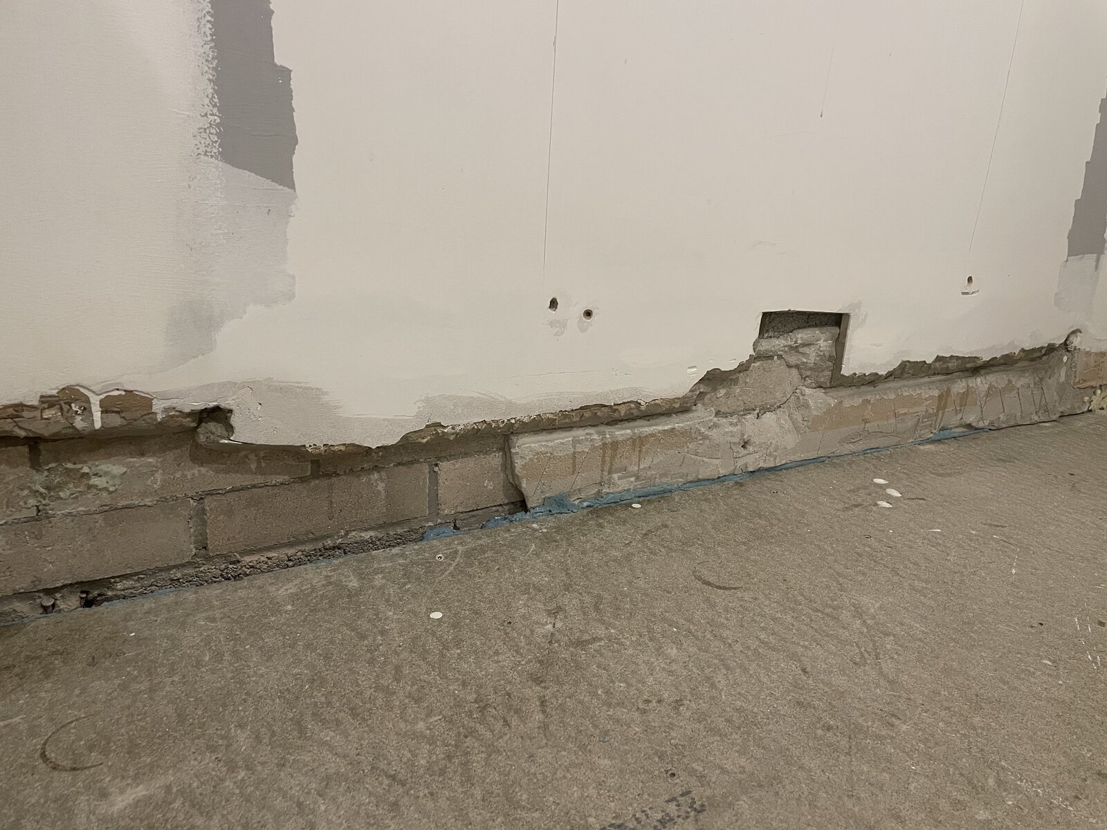 In the 4th photo there is a section of concrete left where the skirting was, which is solid but moves a little bit. Should i hack it out of there before repairing or leave it?