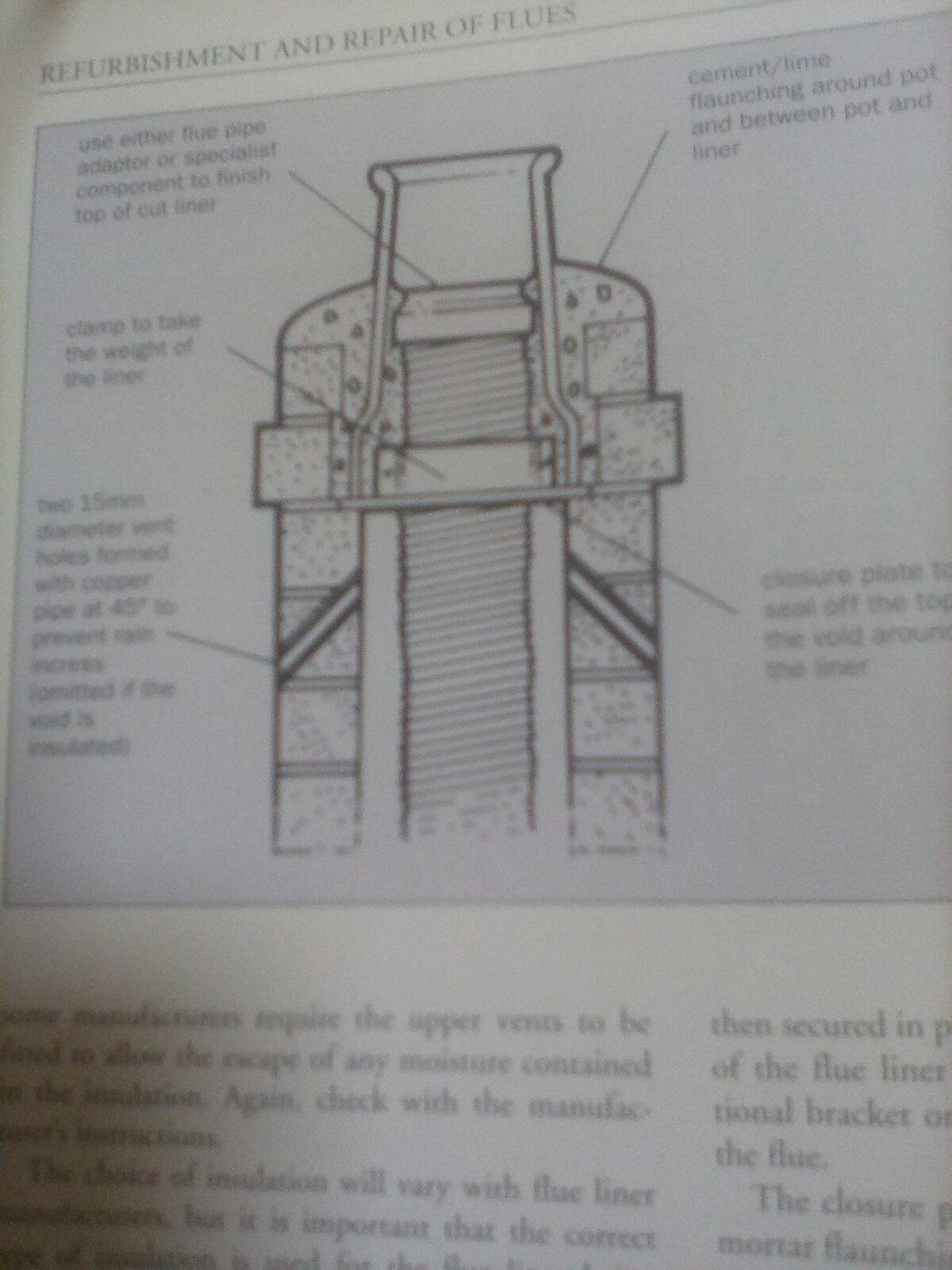 Lining the chimney while I have good scaffolding up on roof. I had to rebuild top of chimney and pots were off anyway. So I have gone for a top clamp on a flexible 5" /125mm stainless steel liner.