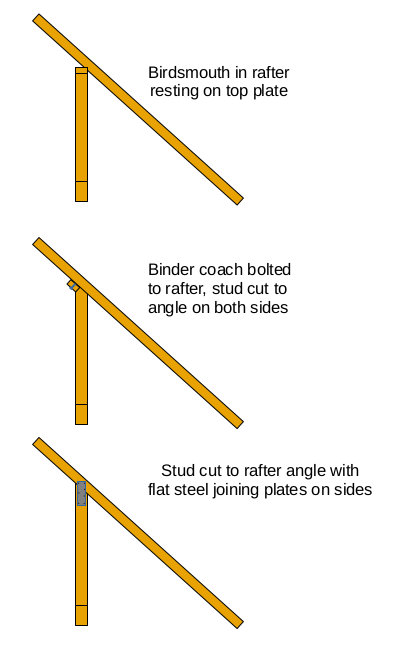 What is the best way to connect a load bearing knee wall to rafters in a loft? If I cut the stud on an angle, and attach them directly to the rafters, any downward load will tend to push the tops of the studs into the room, so I am looking for the best method to prevent that. I don't want to cut into the rafters and bird's mouth them, they are not so deep (old 4x2s).