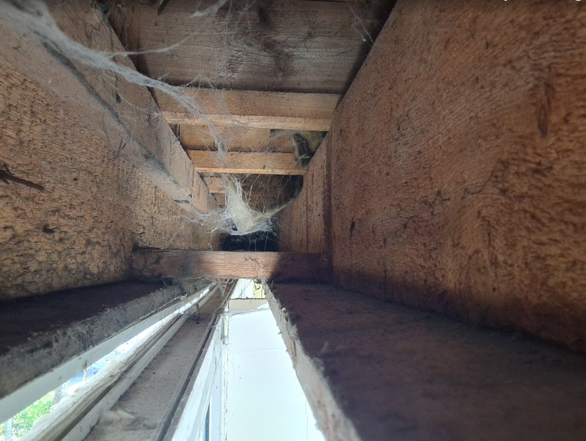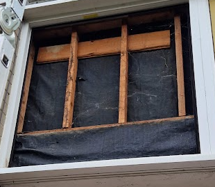 There was a gap at the top of the window frame that has now been fixed. Below the window there are the yellow panels that can be removed exposing the timber and felt.