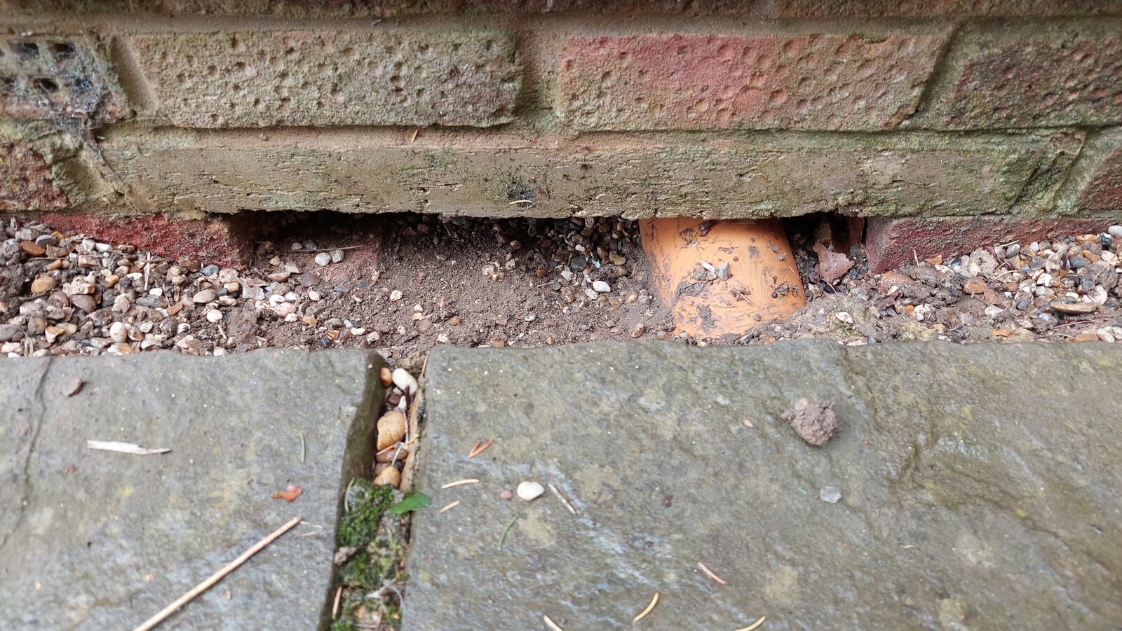 I have discovered that rats and mice are getting into the fabric of the house through a gap next to the toilet so pipe outlet the brick was never finished. See photo. What is the best way of blocking this gap all the way around the pipe to stop the rats and mice?