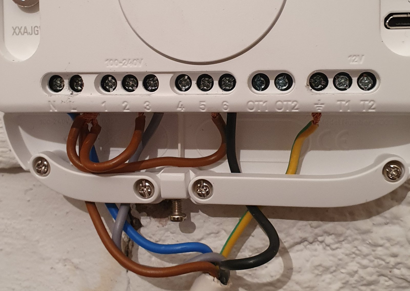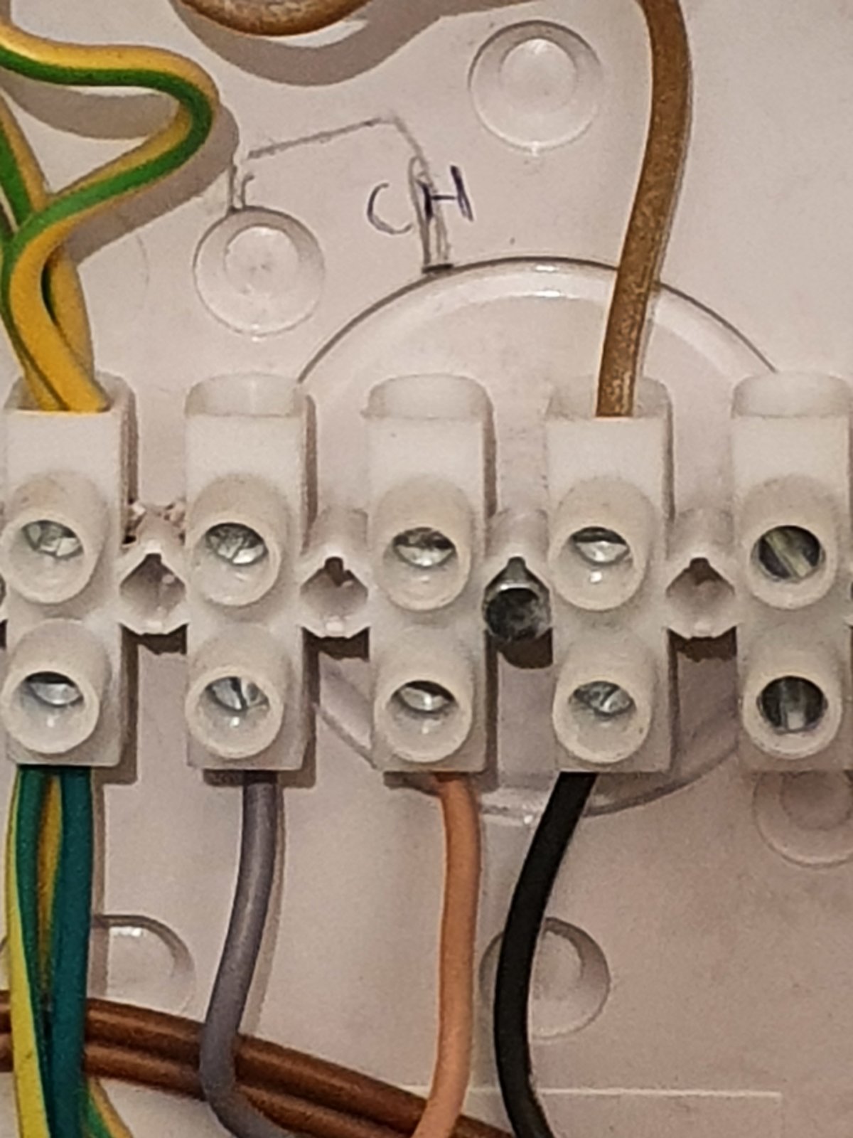...where they terminate at the wiring centre on the left in your photo. Note where they go, and then remove the old thermostat cable and the old thermostat receiver completely. Then join together the two terminals where you have just removed the black and grey wires from.