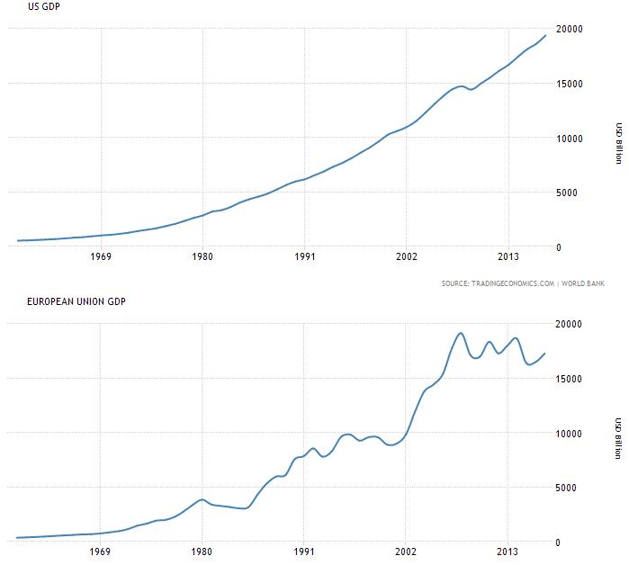Uh, Google says the GDP of the US is $18T, and for the EU it is $17T, so the EU is smaller. Per capita figures are $57k for US and $36k for EU, so even smaller still. Author got his numbers wrong?