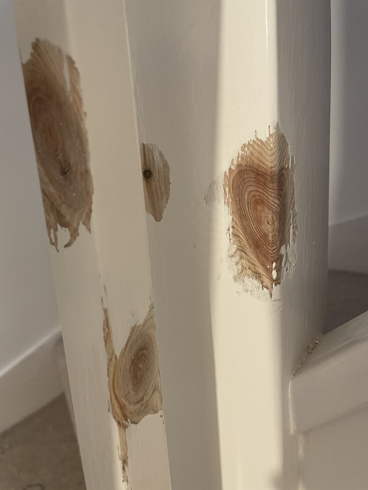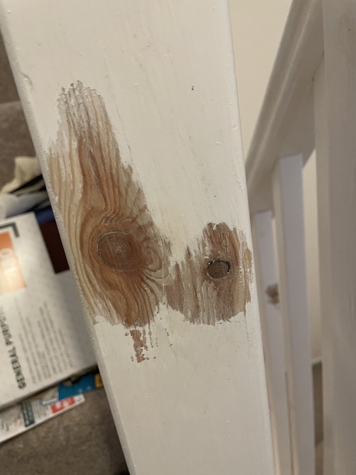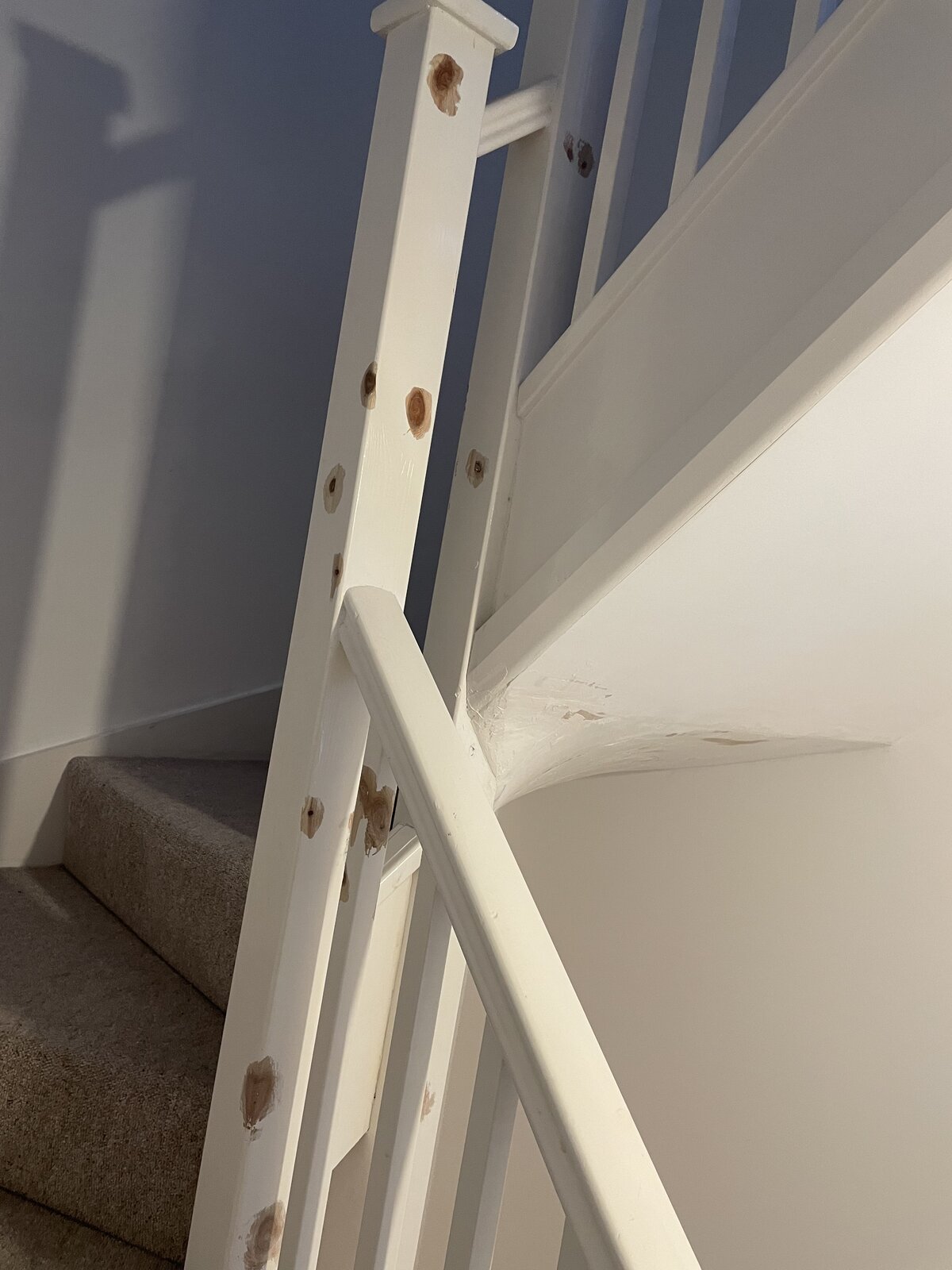 So I had all these knots bleeding through white gloss on my bannisters. I stripped the paint off the knots with paintstripper, scrubbed them with a curly steel scourer a bit and washed them off. I’m planning to paint it all goosewing grey satinwood.