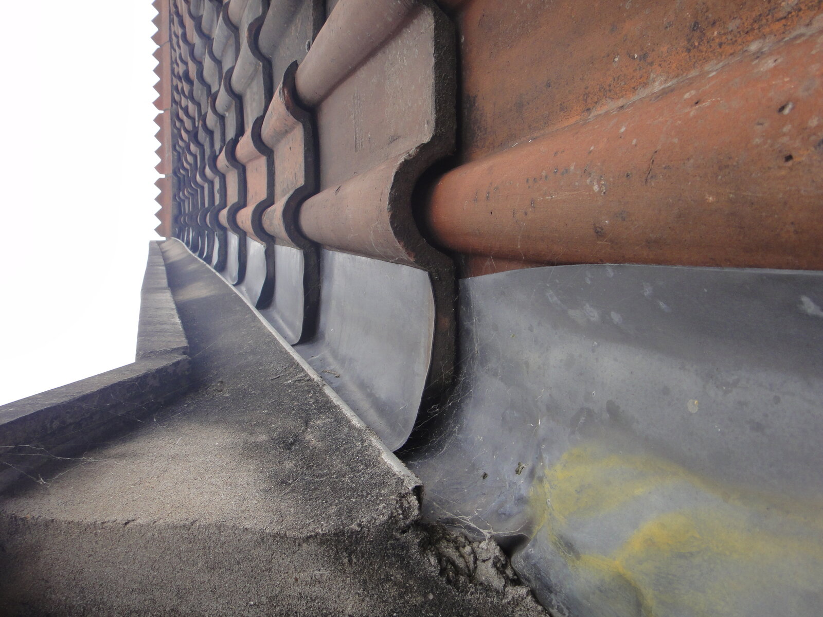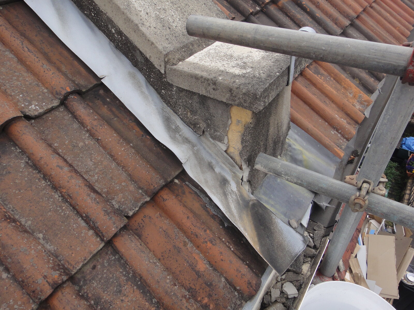 We are doing some work to our roof and alongside the strip and re-felt we will be fitting some lead flashing. The parapets are short however: possibly too short for stepped flshings. The neighbouring houses have both been done with some sort of single cover which appears to be wedged up under the headlap of the tiles and then probably just screwed in behind the bell cast for the render: