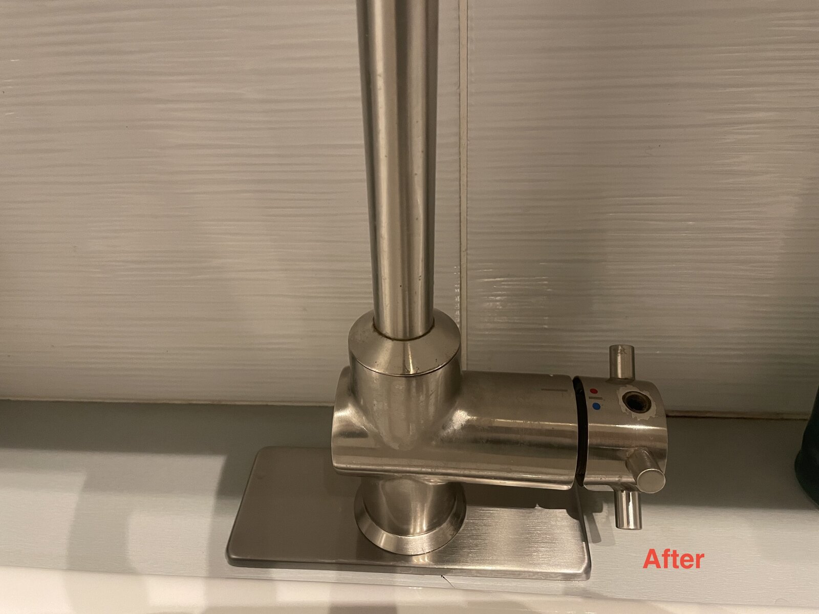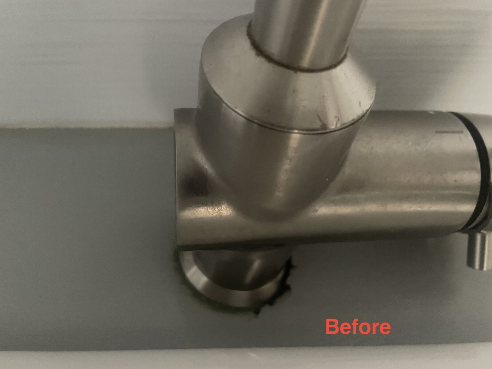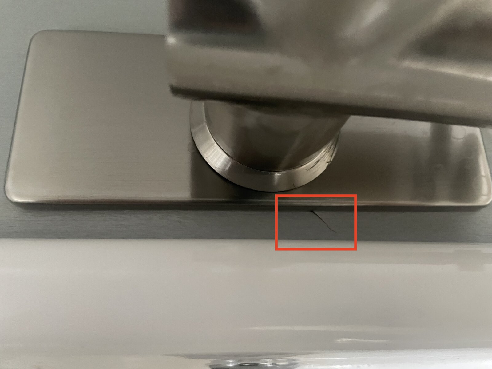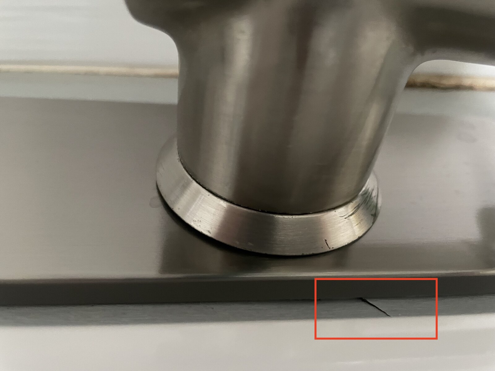 Our tap was sinking into the countertop due to water damage, and the problem was getting worse. The tap has been like this since we moved into the apartment, but it was nearly impossible to get the landlord to fix it. So, we came up with a temporary fix ourselves. We covered the tap hole with a metal plate that we purchased from Amazon, which worked wonders. I've attached before and after photos for reference. However, the metal plate isn't large enough to cover some small cracks around the hole. I'm concerned about water seeping through these cracks. Does anyone have any suggestions on what I can do to prevent water from getting through these cracks?