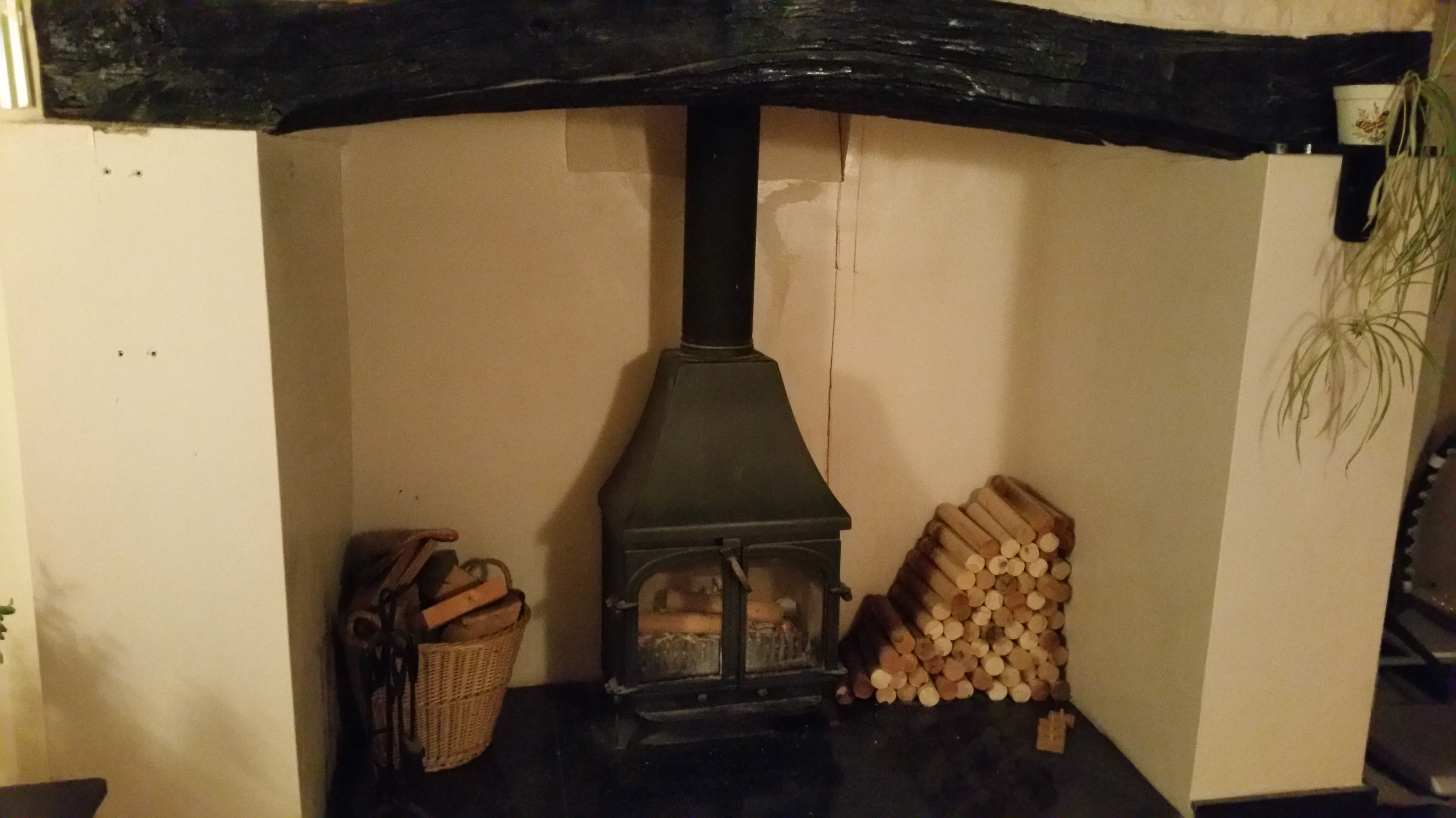 I am renovating my front room which has a log burner installed in an inglenook. The plaster behind the log burner has cracked. The fire is only 50mm from the back wall, so i am thinking of bring that forward to around 150mm, or is that a bit too much? and re plastering, would normal multi finish be ok? Would that prevent the plaster from cracking again? also, as the existing plaster has cracks in it would it be better to remove the old plaster first?