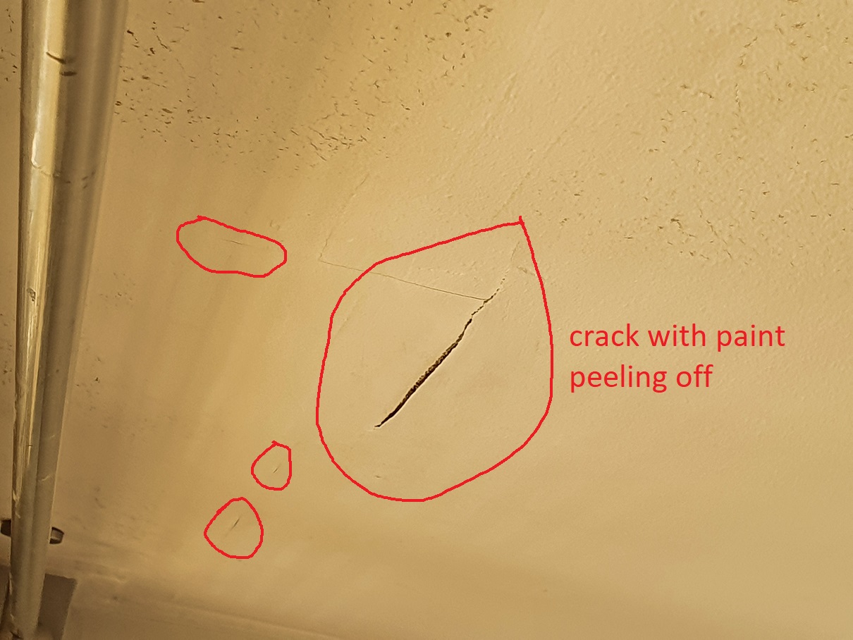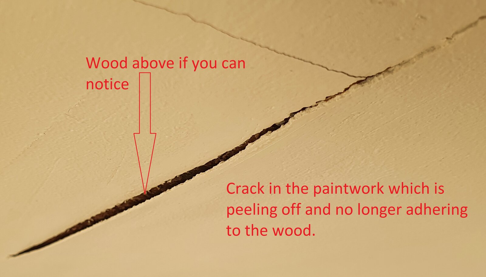 Now this part of the ceiling has been suffering from condensation leading to a light mould growth. There is also a crack in the paint work, with the paint work kinda not adhering to the wood above and peeling from it (just at those cracked locations).