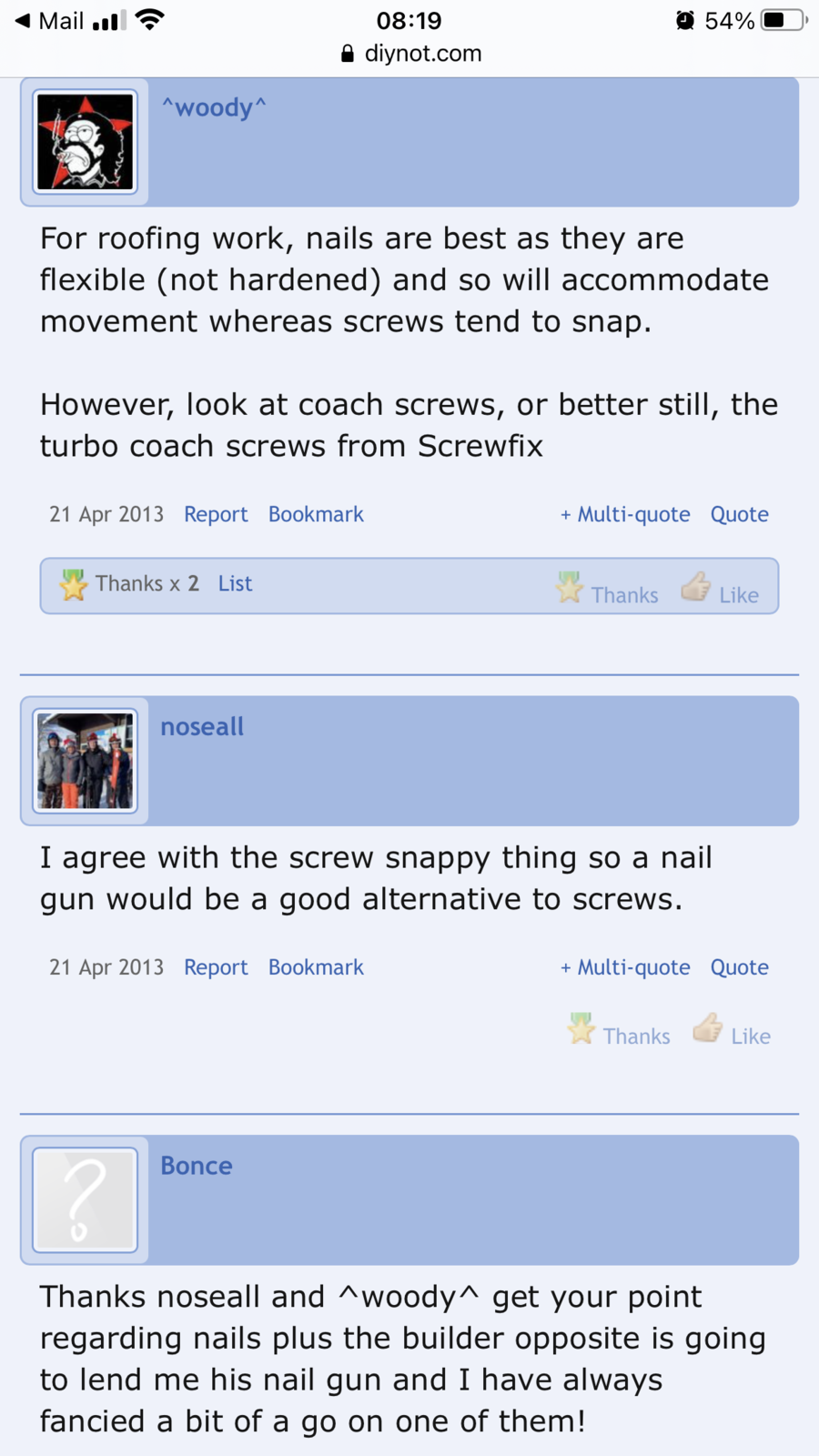 I have some c24 4x2 which will be used and was intending to screw them in until I read that screws are less favourable and nails should be used due to their flexibility.