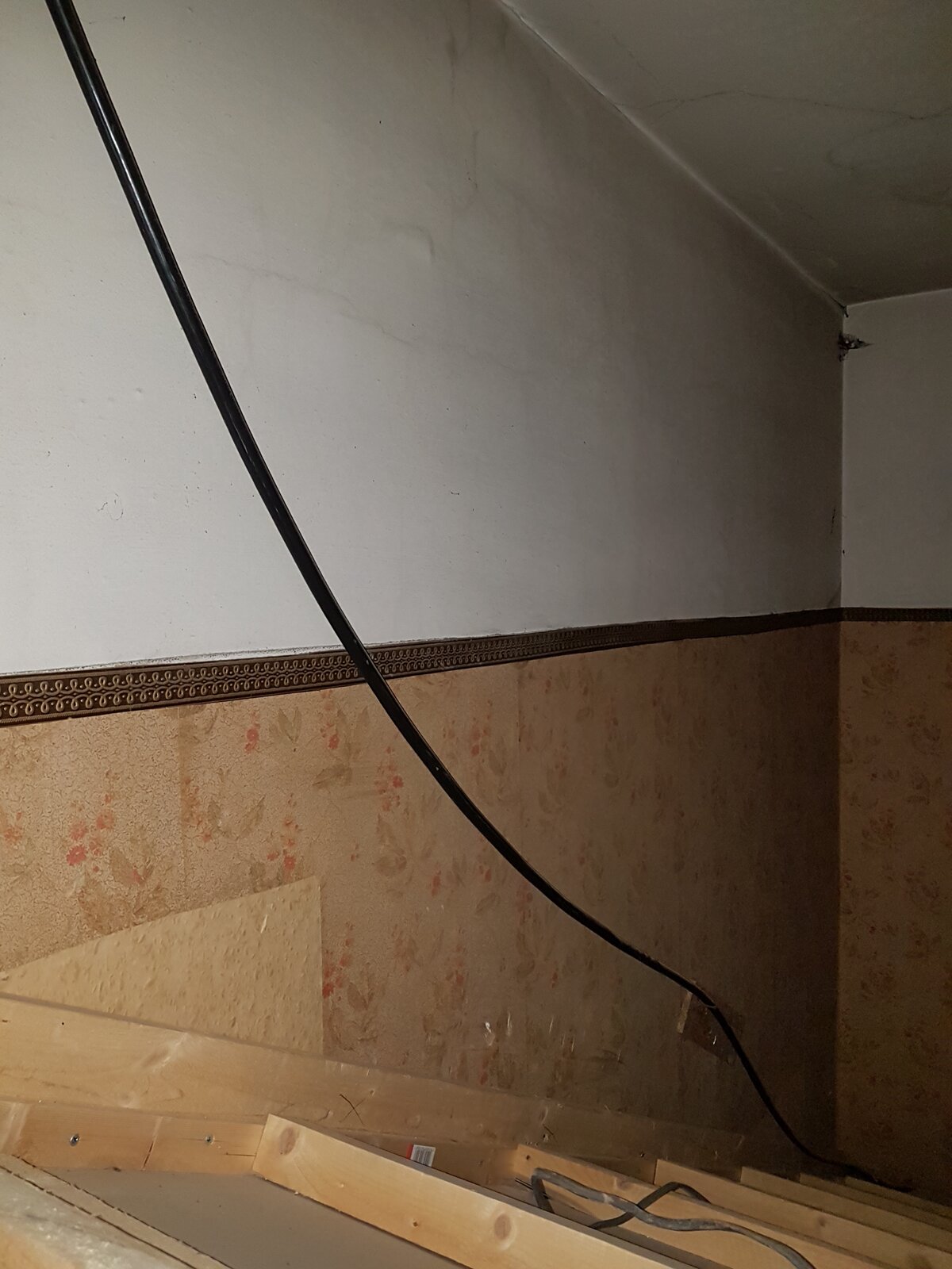 I live in a first floor flat and am doing some decorating. I removed a panel above the door at the top of my stairs and could see the area above the stairs. I was interested to see how the SWA cable that supplies my electric meter is attached to the wall. I'm not going to let the DNO fix it unless they will also redecorate.