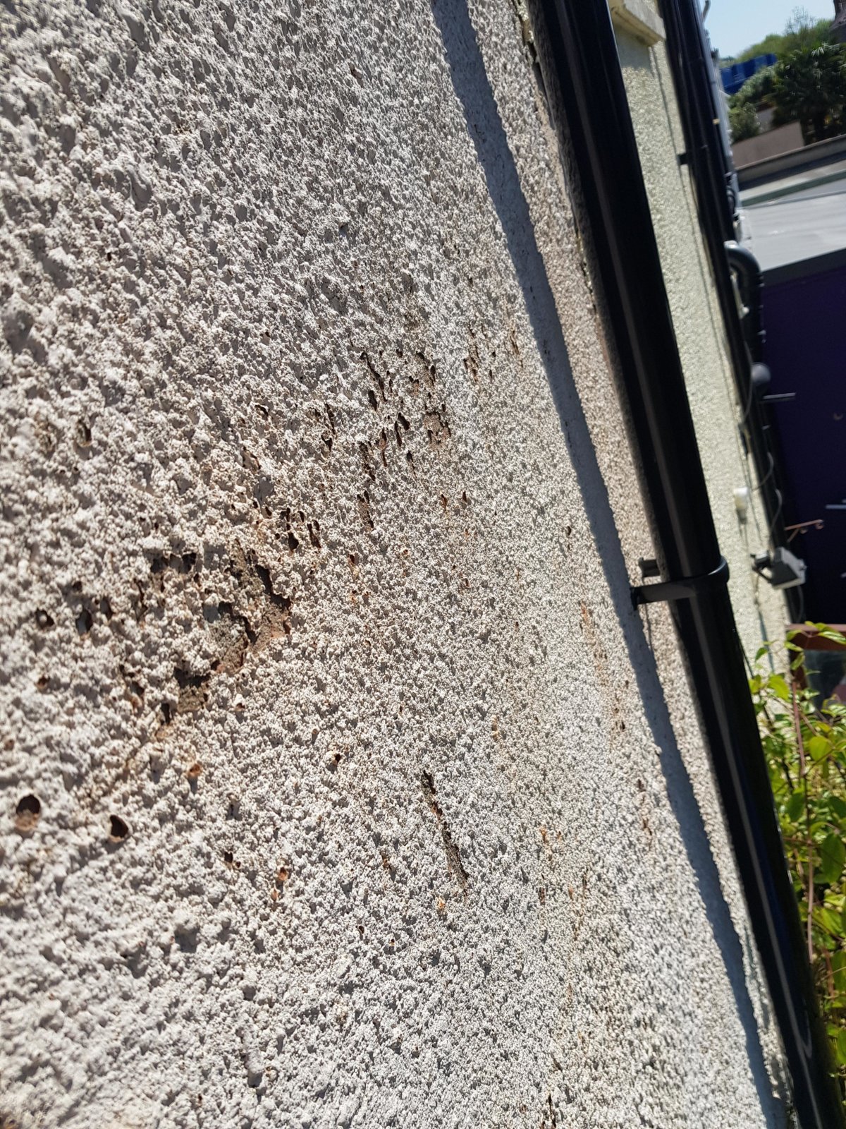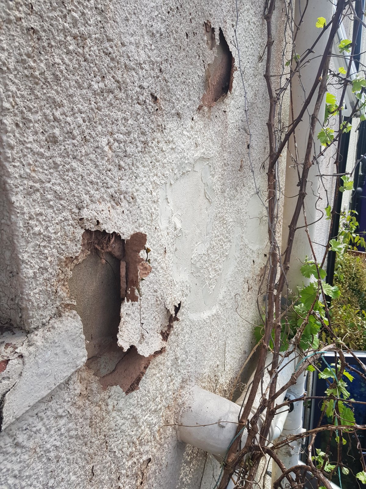 I wanted to paint the exterior, but realised there are a few issues with the render. What is the best course of action to deal with these considering I've never done any rendering before. Or is it worth paying someone to do it if I'm a complete amateur.