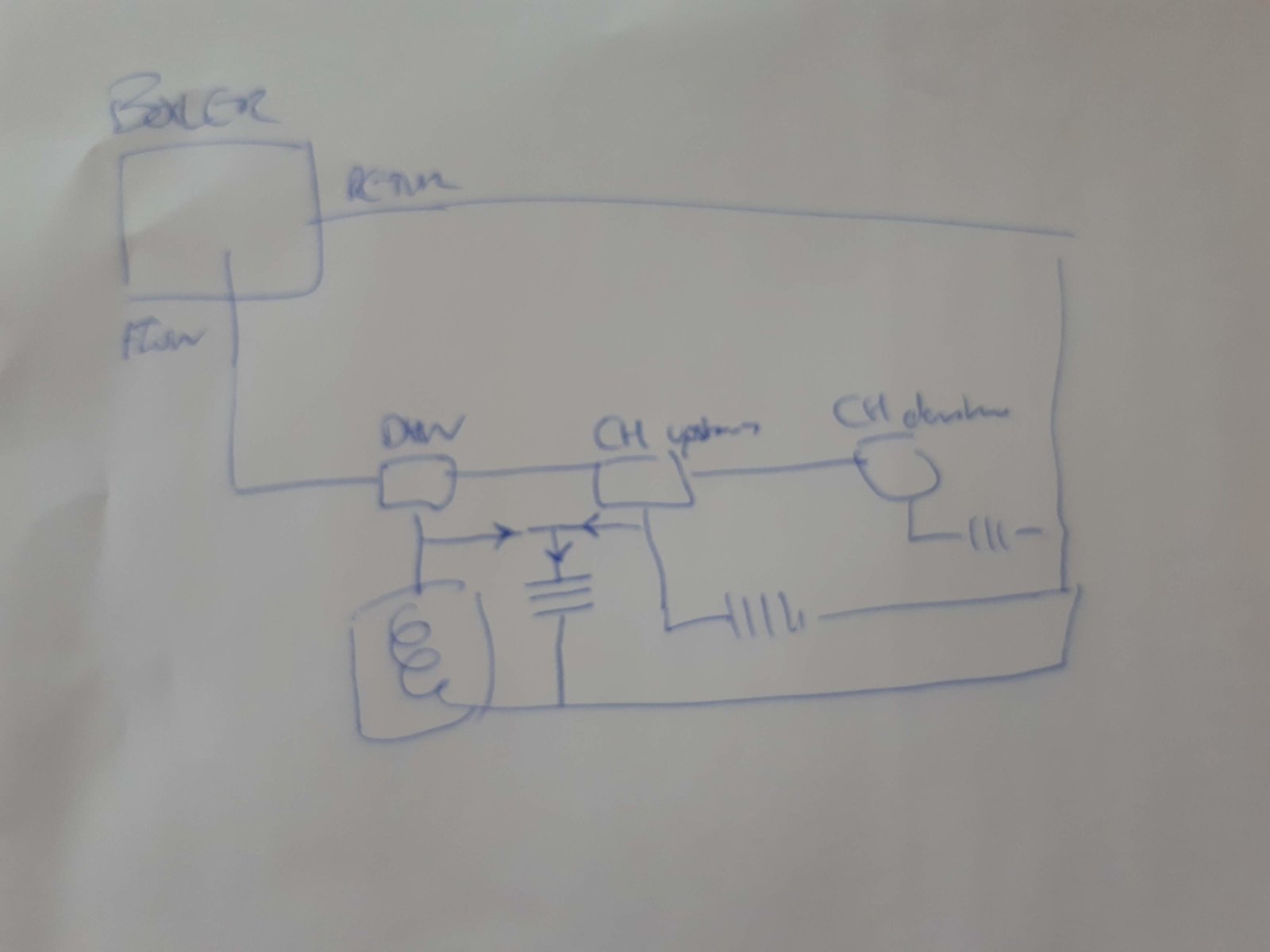 - Connected after both the DHW and CH upstairs valve, but with a non return valve to stop unintended flow into the other zone ie. ensure the water only flows in the direction of the arrows in my picture. However would the non return valve add so much restriction that most of the water would just go through the tank and not warm the towel rail?