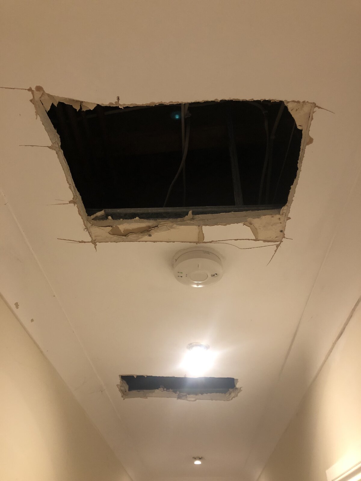 I imagined that the cause of the creaking noise would be a bit of the subfloor that wasn't properly fixed to a joist, allowing the whole thing to move around when stepped on. I cut two holes in my hallway ceiling to get a closer look (see attached photos). When I poke my head through the second hole (furthest from the camera), the creaking noise is very close by - I can hear it, but I can't see anything moving up there.