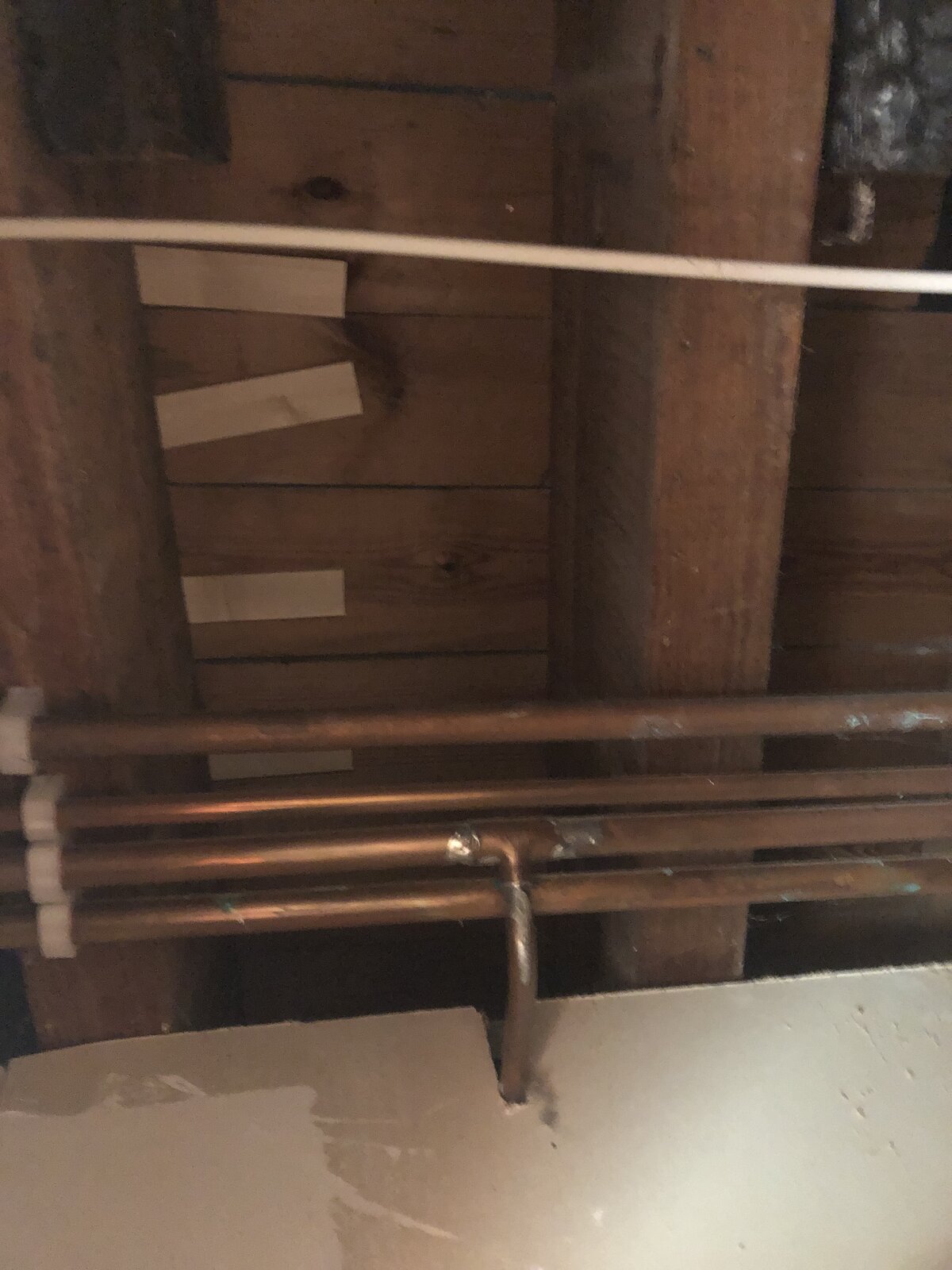 I did see one spot where there was a bit of a gap between the subfloor and one of the joists (although I couldn't see it moving when the creaking was happening). I got hold of some wooden shims and popped them into the gap (visible in the photo) as a test anyway, but it hasn't fixed the problem, so I guess I need to look elsewhere.
