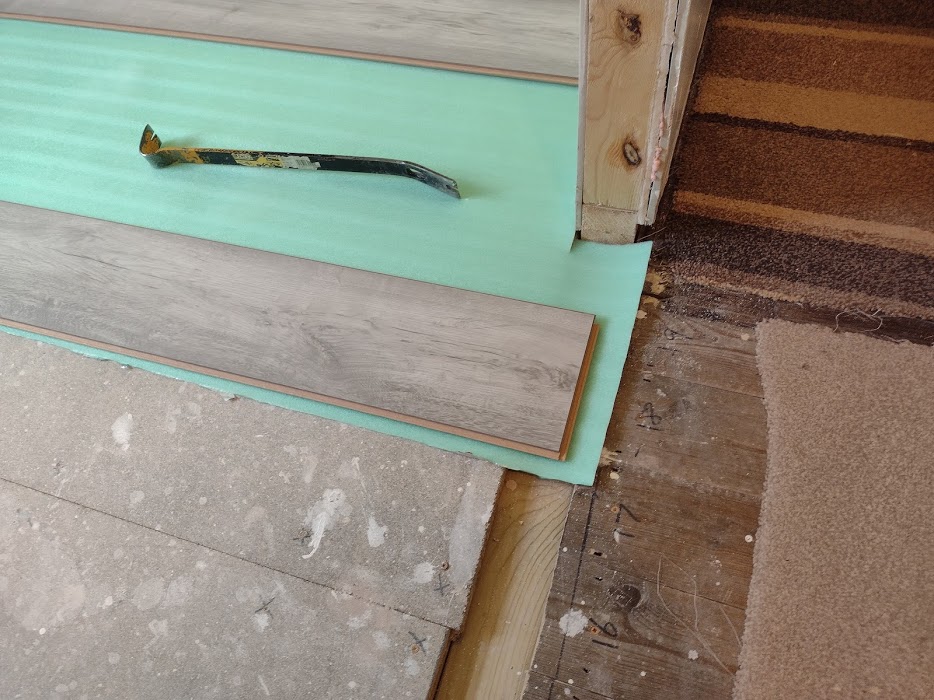As soon as I've finished painting I will put laminate floor boards down (they are in the car already!). Should I start at the door entrance (different flooring will be in the corridor) with a cut down board at the wall, or start at the wall and work to the door? I will be filling that gap with some more floorboards beforehand.