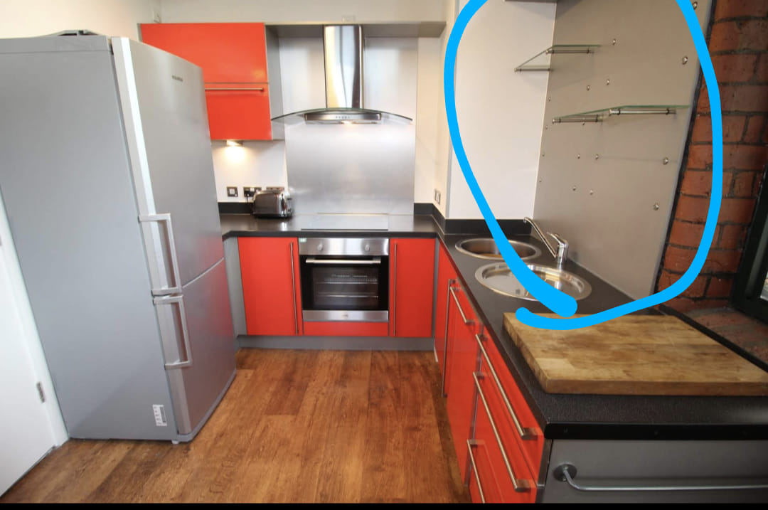 I have this AWFUL looking grey splashback panel in my kitchen sink area (circled blue), and whilst I'm doing some renovations to improve the appearing of my entire kitchen, I realised THIS HAS GOT TO GO. Plan is to expose the bricks, and put some rustic solid wood plank shelves there for plants and decorative kitchen items.