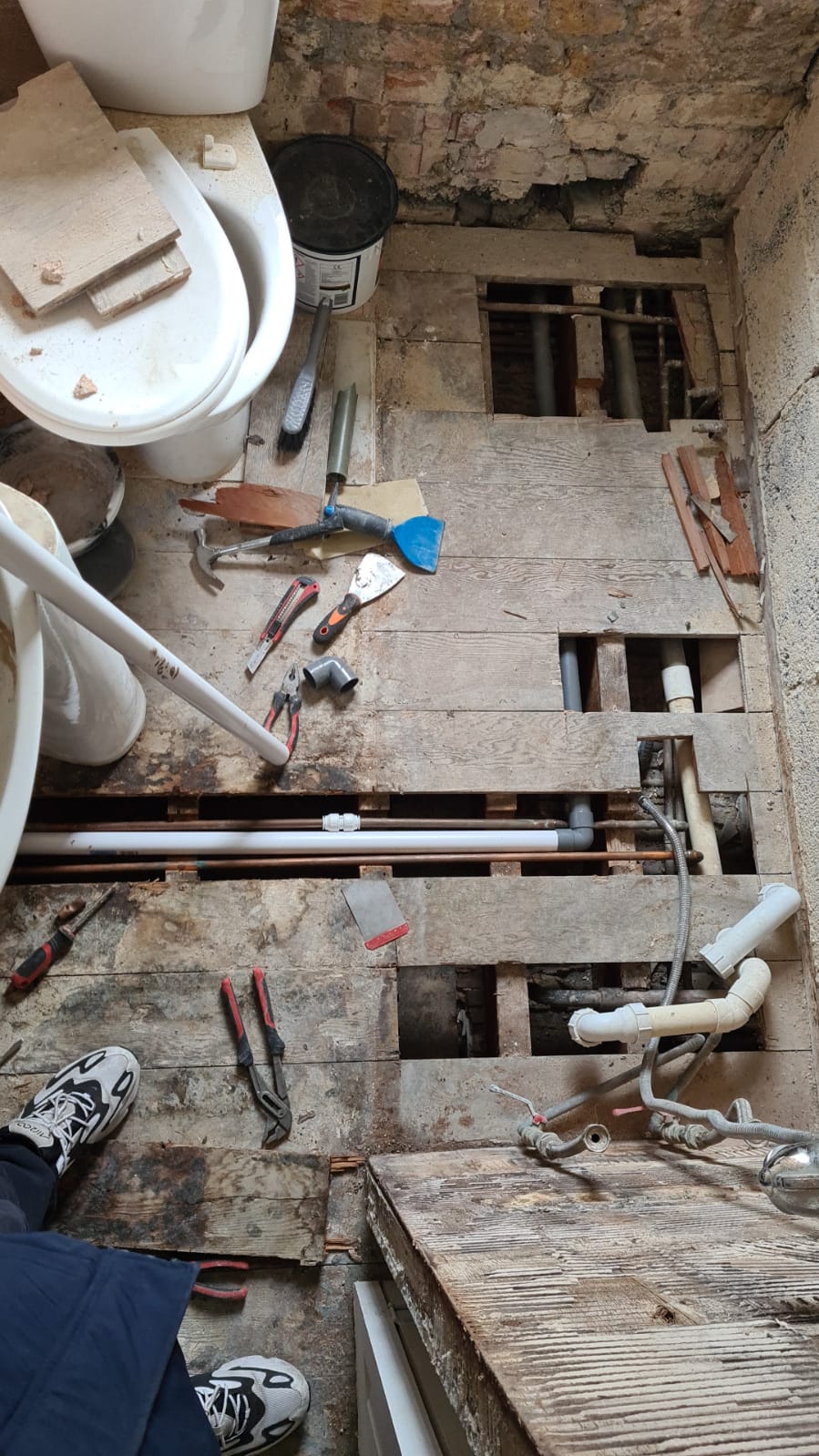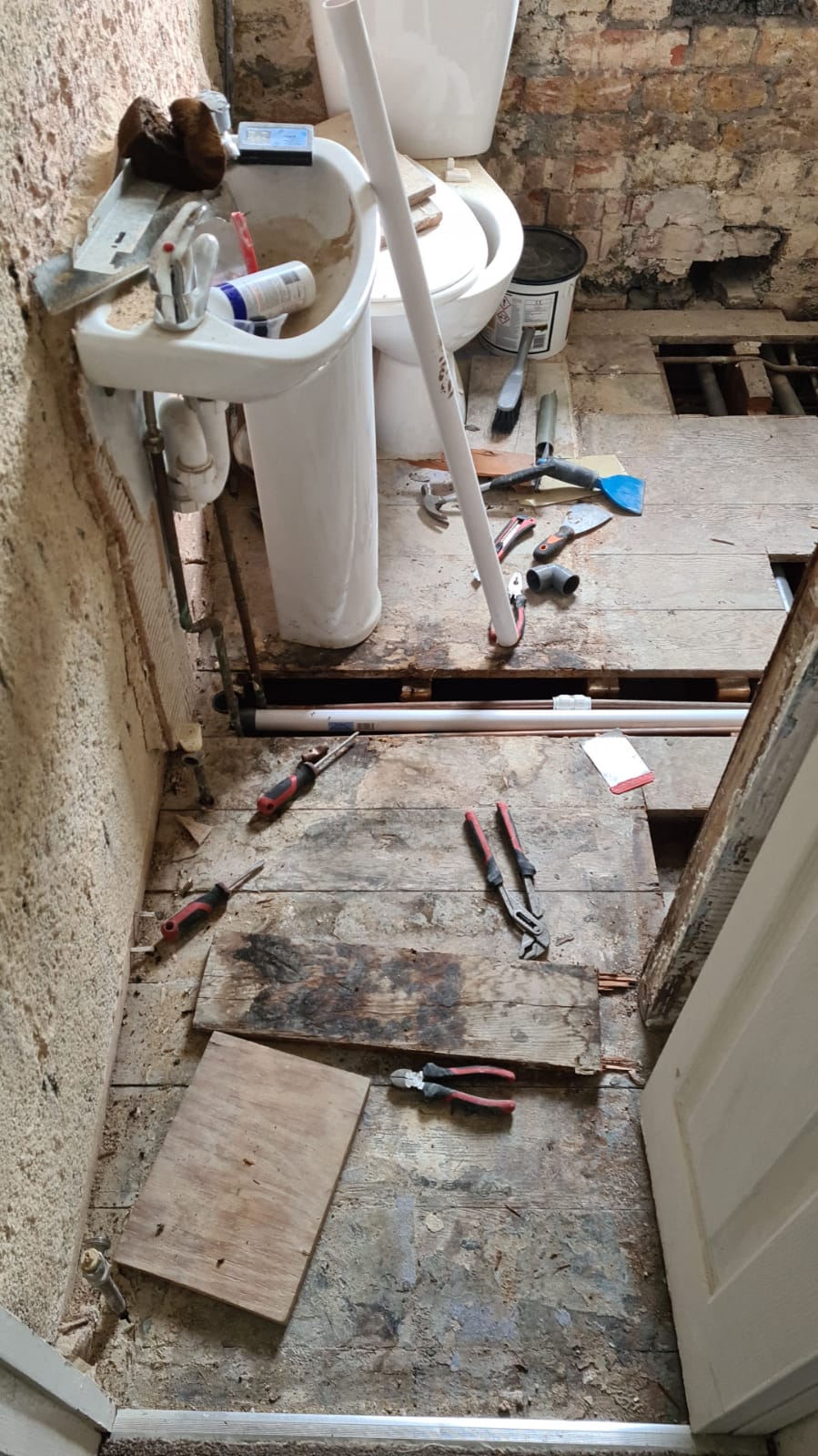 At the moment the property is is two Storey as in ground and first and the bathroom is on the first directly below is the hallway and there is a brown discoloration coming through
