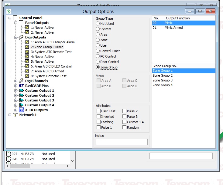 digi 4 to trigger 4 (of speech dialler) and set group type AREA + areas A +output function GUARD ACCESS ALARM (PIR)