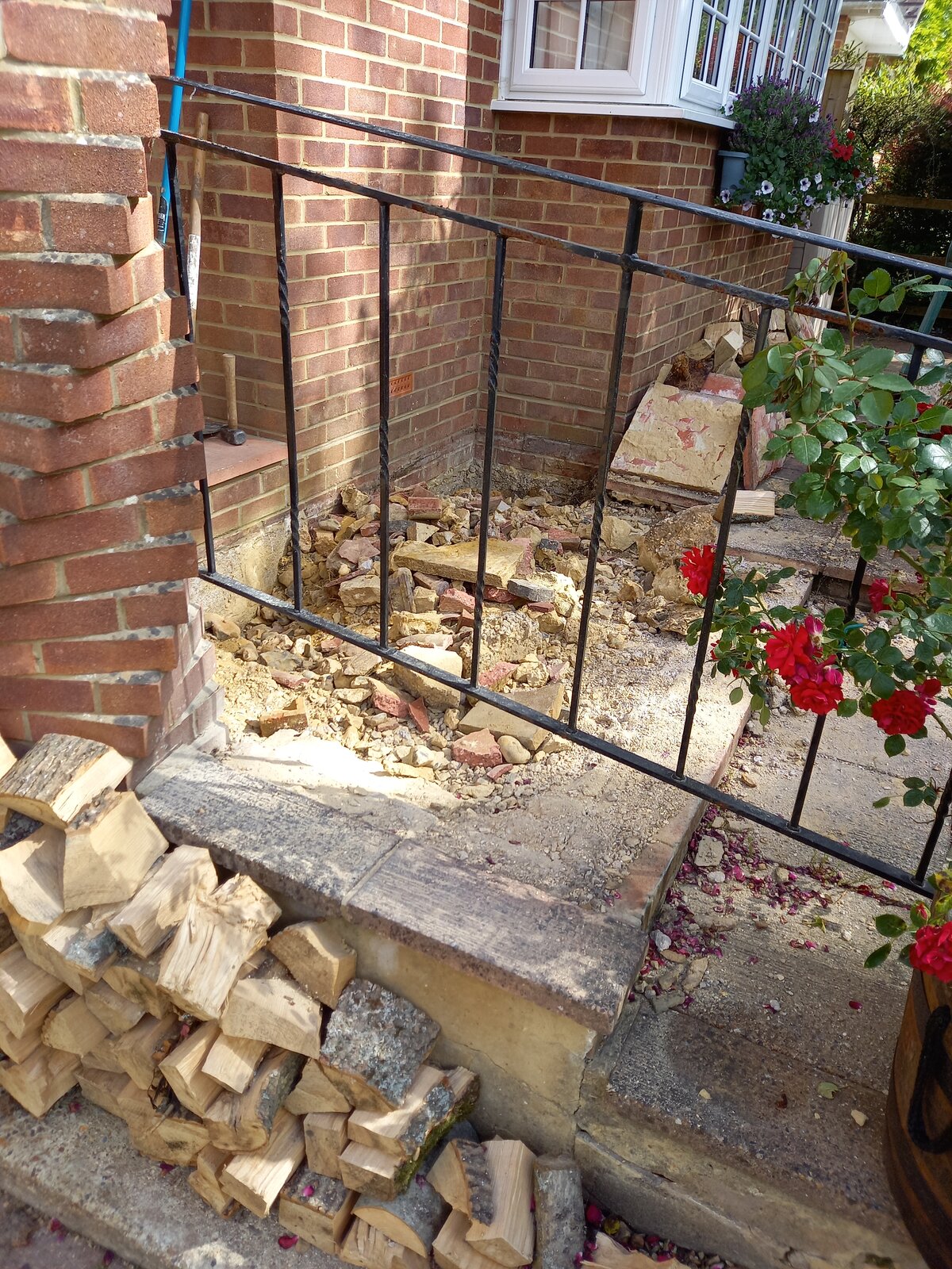Long version: There is a stepped patio going up to the front of my house. Several of the slabs had dropped by an inch or two, so I had the bright idea of lifting the problem slabs and sorting it out. I only wanted to sort this one section, as most of the rest is okish. My plan was to level and reset the dodgy bit, then repoint the lot.
