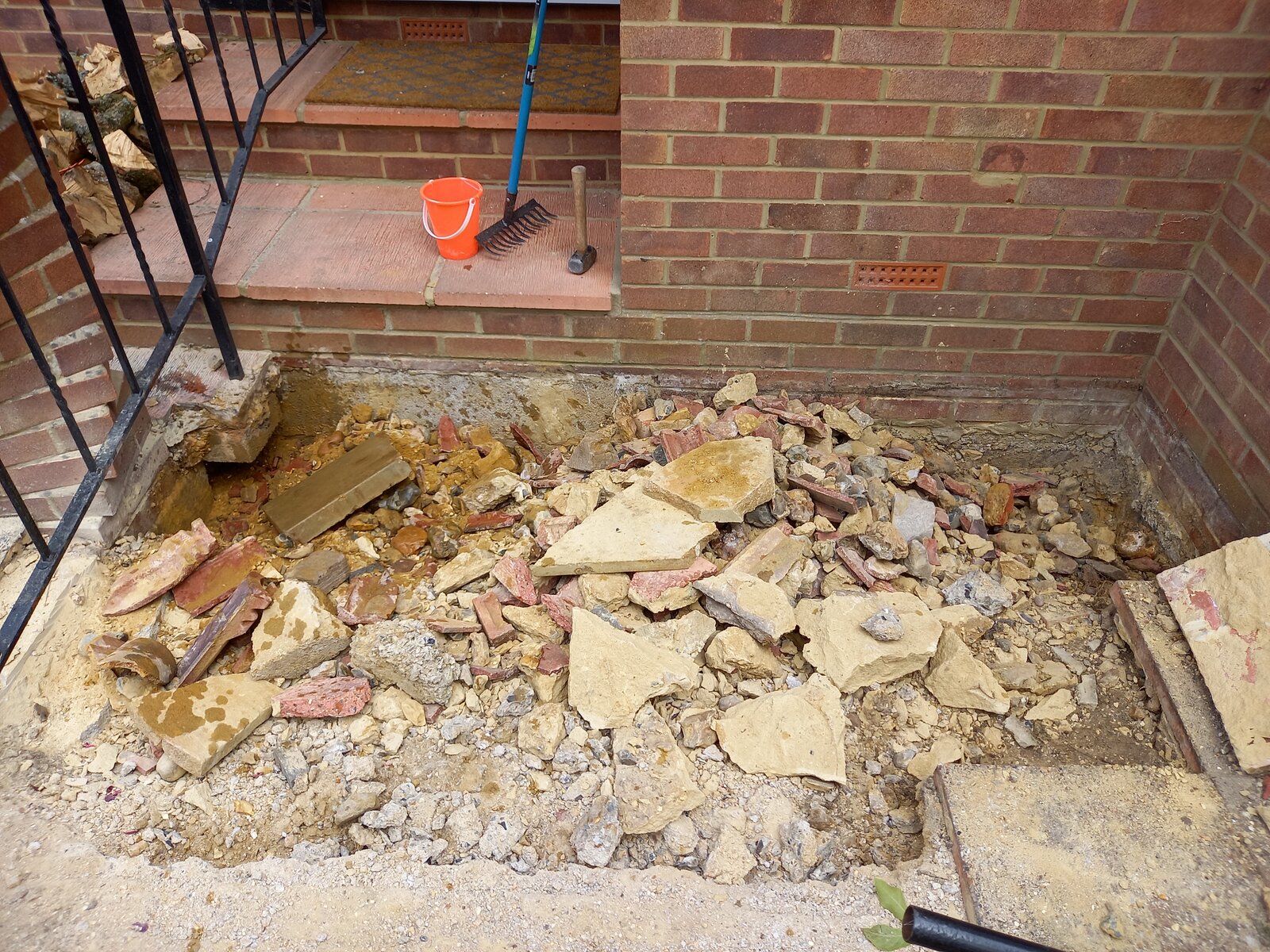 Turns out this section had been layed on a sand and cement base, but this was floating over two inches of air and then what must be a foot or two of big loose rubble - we're talking big bits of roof tile, brick, half patio slabs etc. There's a slope in the ground level, so this section has had to be built up to the height of the house. Loads of air pockets all the way through, one large enough for a mouse to live in!