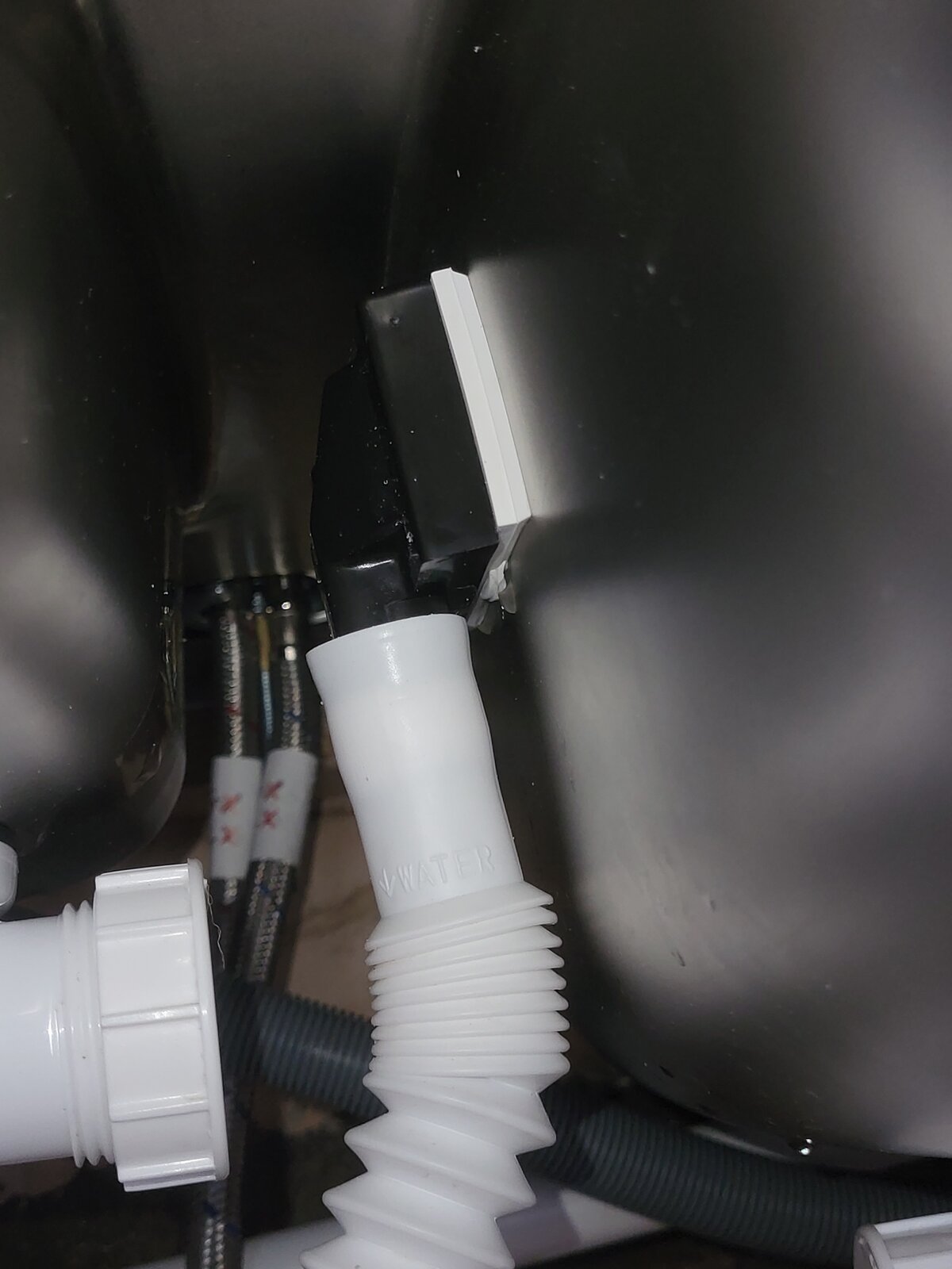 It leaks from the drainage hole in the sink and then though the area on the picture here? Where the white part meets the metallic sinks, it comes through the edges.