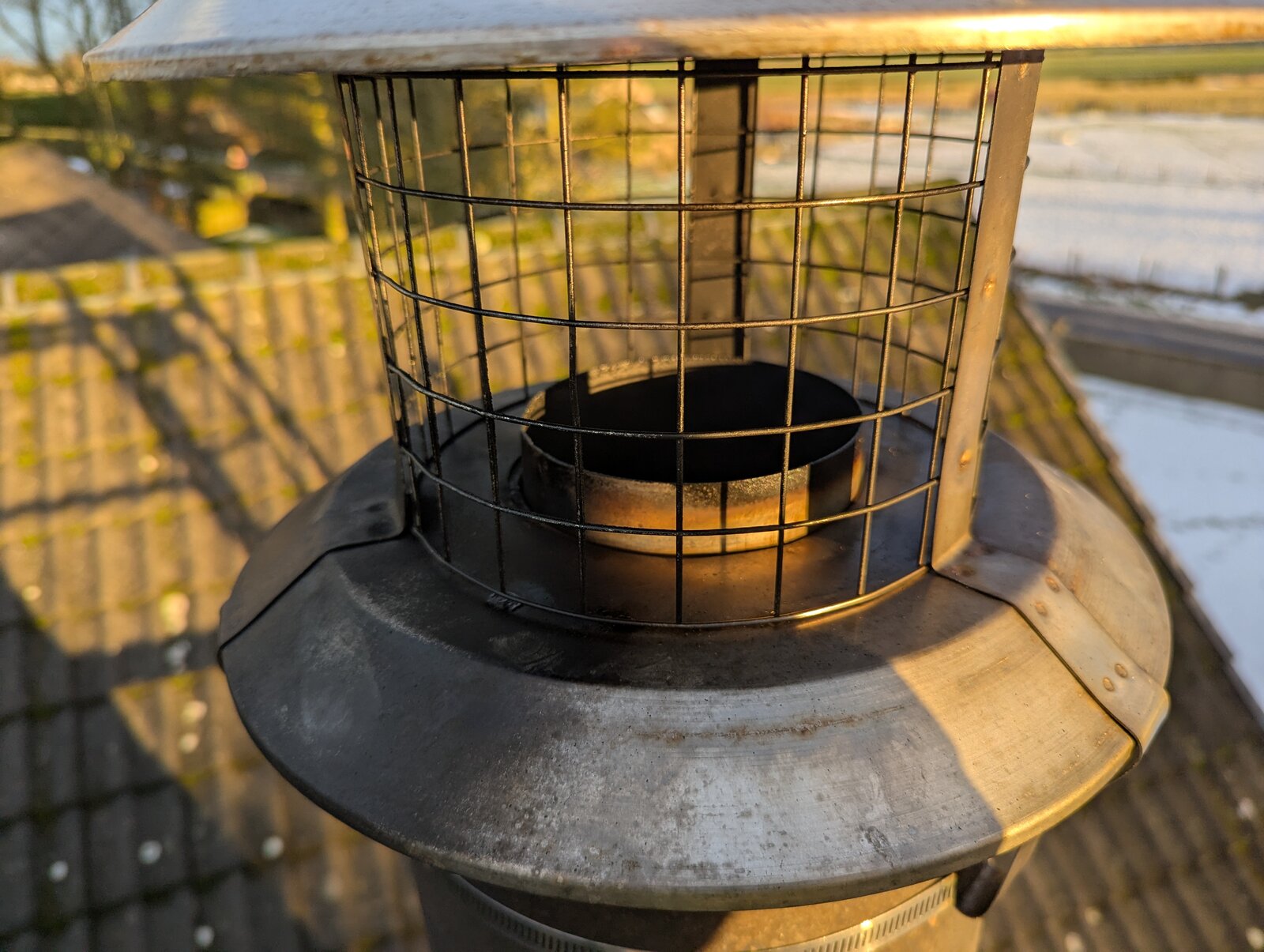 Theoretically a cowl with a deeper skirt could sort that (the Colt one maybe) or perhaps it could be possible to point up the gap with some stiff mortar.....no metal would be needed here. The deeper skirt should allow the rain to drip out of the way.