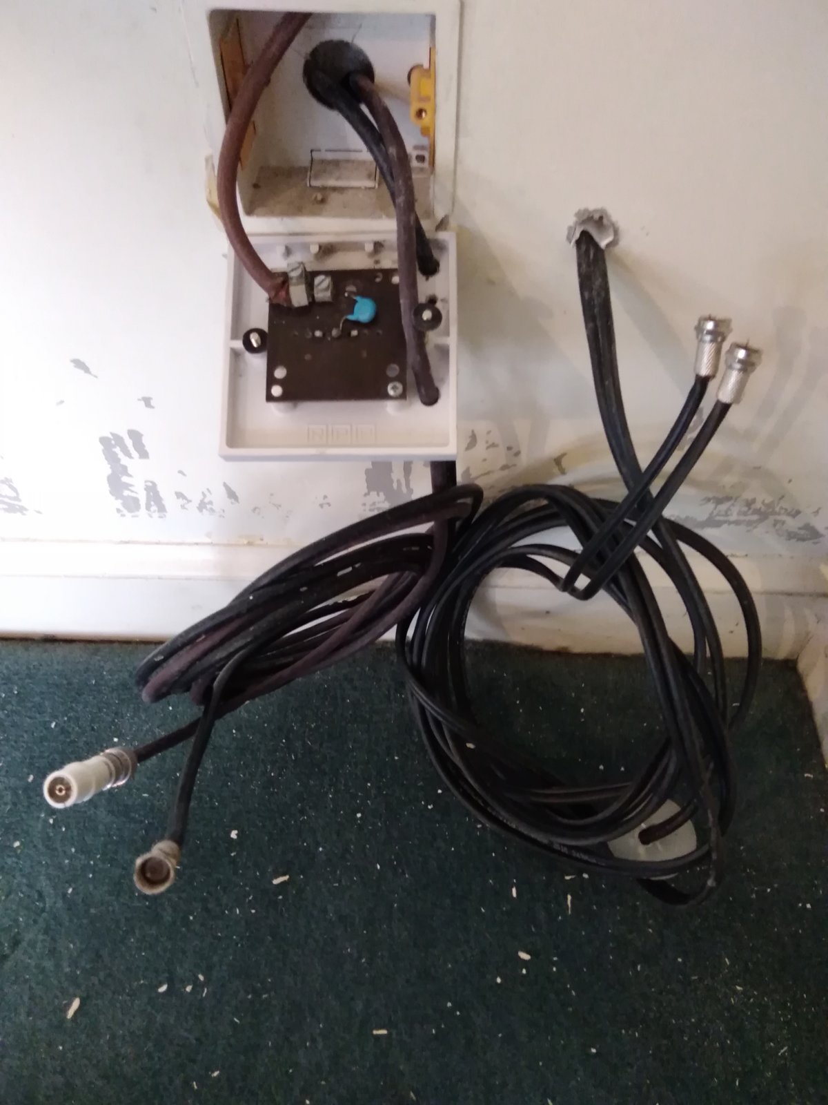 There is a double cable from the sat receiver, the rest I'm not sure about but one seems to be coming from an antenna, and another running along an outside wall to a socket at the far end of the house. There is a powered distributer in the roof space.