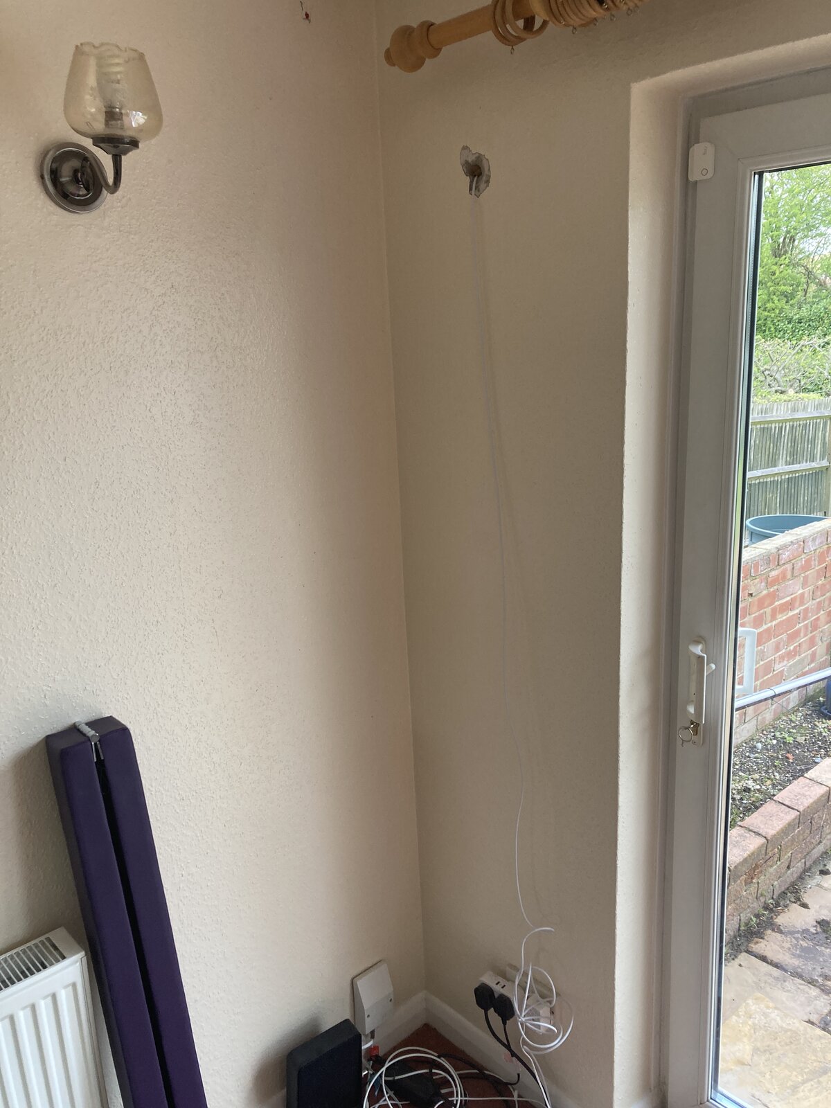 Any suggestions regarding best way to tidy this up? This room hasn’t been renovated as yet hence the dated decor. Ideally I’d want to keep it serviceable and one end of the cable is hardwired to the plug, and the end that plugs into the camera is around 10mm wide so not that small. I could run the cable externally a bit further to the patio door and run it down internally but I would have to create a sizeable hole in the frame to thread it through.
